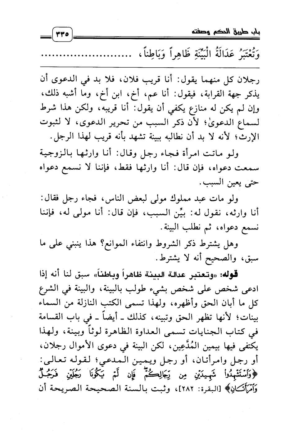 قوله: «وتعتبر عدالة البينة ظاهراً وباطناً» سبق لنا أنه إذا ادعى شخص على شخص بشيء طولب بالبينة، والبينة في الشرع كل ما أبان الحق وأظهره، ولهذا تسمى الكتب النازلة من السماء بينات؛ لأنها تظهر الحق وتبينه، كذلك ـ أيضاً ـ في باب القسامة في كتاب الجنايات تسمى العداوة الظاهرة لوثاً وبينة، ولهذا يكتفى فيها بيمين المُدَّعِين، لكن البينة في دعوى الأموال رجلان، أو رجل وامرأتان، أو رجل ويمين المدعي؛ لقوله تعالى: {وَاسْتَشْهِدُوا شَهِيدَيْنِ مِنْ رِجَالِكُمْ فَإِنْ لَمْ يَكُونَا رَجُلَيْنِ فَرَجُلٌ وَامْرَأَتَانِ} [البقرة: 282]، وثبت بالسنة الصحيحة الصريحة أن