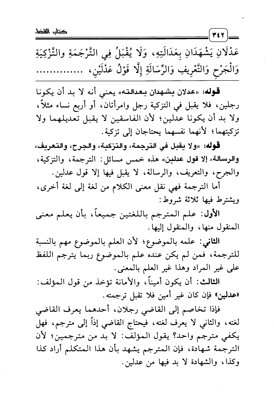 قوله: «ولا يقبل في الترجمة، والتزكية، والجرح، والتعريف، والرسالة، إلا قول عدلين» هذه خمس مسائل: الترجمة، والتزكية، والجرح، والتعريف، والرسالة، لا يقبل فيها إلا قول عدلين.