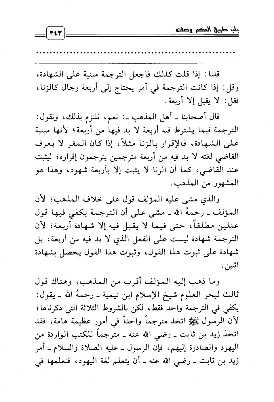 وما ذهب إليه المؤلف أقرب من المذهب، وهناك قول ثالث لبحر العلوم شيخ الإسلام ابن تيمية ـ رحمه الله ـ يقول: يكفي في الترجمة واحد فقط، لكن بالشروط الثلاثة التي ذكرناها؛ لأن الرسول صلّى الله عليه وسلّم اتخذ مترجماً واحداً في أمور عظيمة هامة، فقد اتخذ زيد بن ثابت ـ رضي الله عنه ـ مترجماً للكتب الواردة من اليهود والصادرة إليهم، فإن الرسول ـ عليه الصلاة والسلام ـ أمر زيد بن ثابت ـ رضي الله عنه ـ أن يتعلم لغة اليهود، فتعلمها في