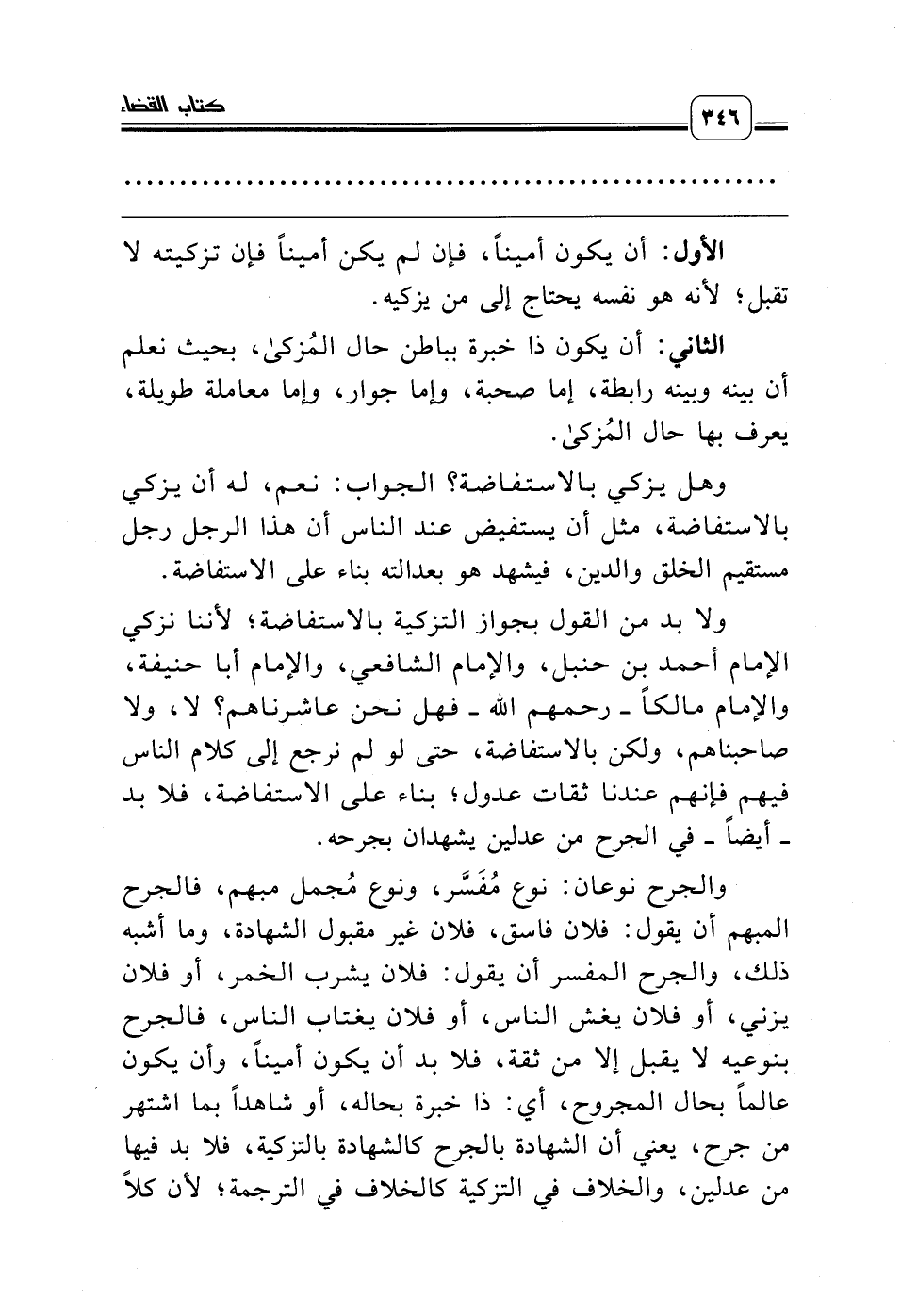 ولا بد من القول بجواز التزكية بالاستفاضة؛ لأننا نزكي الإمام أحمد بن حنبل، والإمام الشافعي، والإمام أبا حنيفة، والإمام مالكاً ـ رحمهم الله ـ فهل نحن عاشرناهم؟ لا، ولا صاحبناهم، ولكن بالاستفاضة، حتى لو لم نرجع إلى كلام الناس فيهم فإنهم عندنا ثقات عدول؛ بناء على الاستفاضة، فلا بد ـ أيضاً ـ في الجرح من عدلين يشهدان بجرحه.
