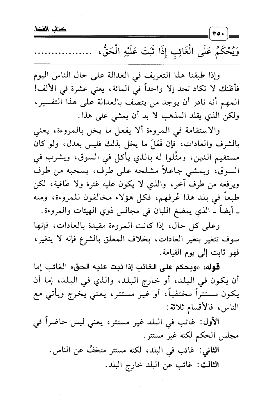 وإذا طبقنا هذا التعريف في العدالة على حال الناس اليوم فأظنك لا تكاد تجد إلا واحداً في المائة، يعني عشرة في الألف! المهم أنه نادر أن يوجد من يتصف بالعدالة على هذا التفسير، ولكن الذي يقلد المذهب لا بد أن يمشي على هذا.