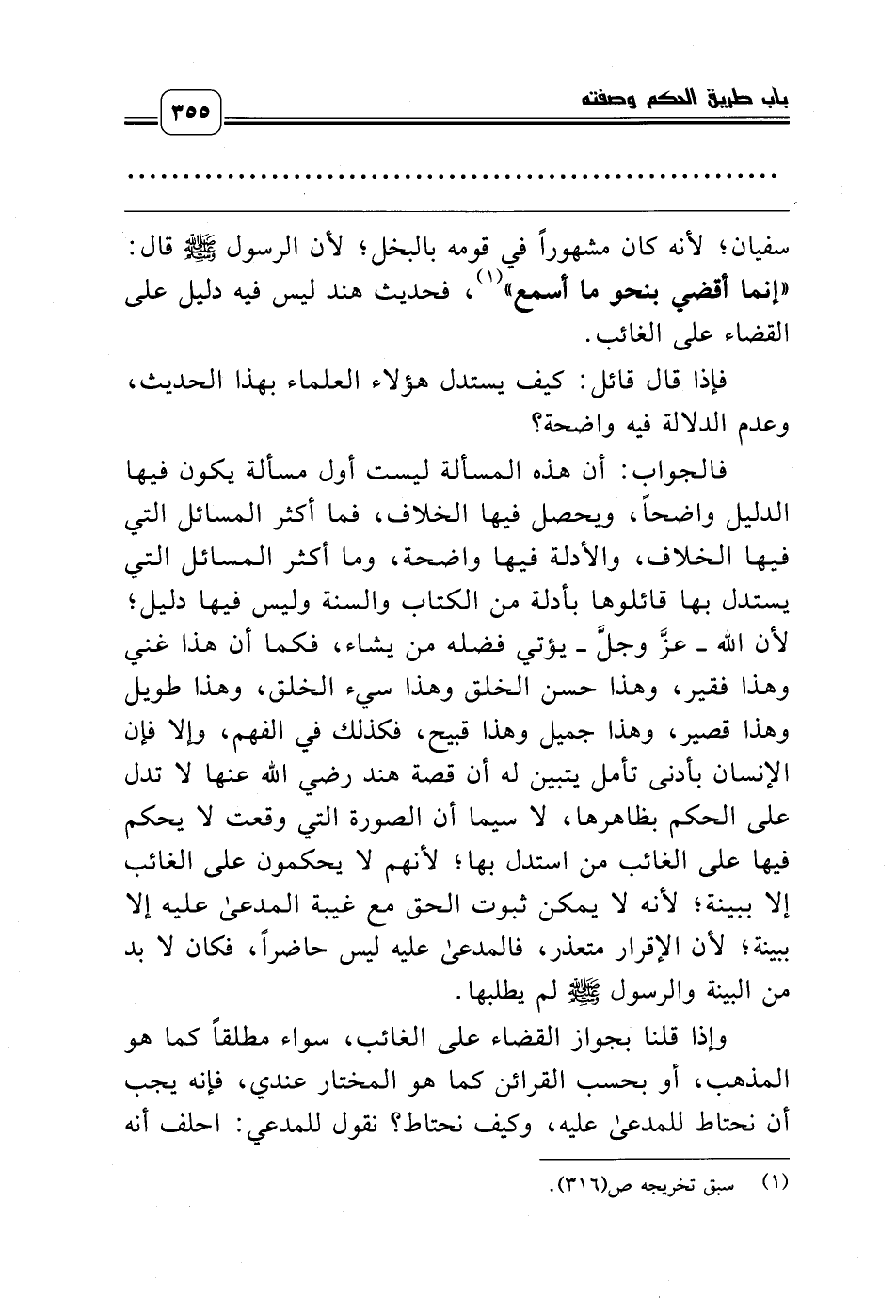 سفيان؛ لأنه كان مشهوراً في قومه بالبخل؛ لأن الرسول صلّى الله عليه وسلّم قال: «إنما أقضي بنحو ما أسمع» (¬1)، فحديث هند ليس فيه دليل على القضاء على الغائب.