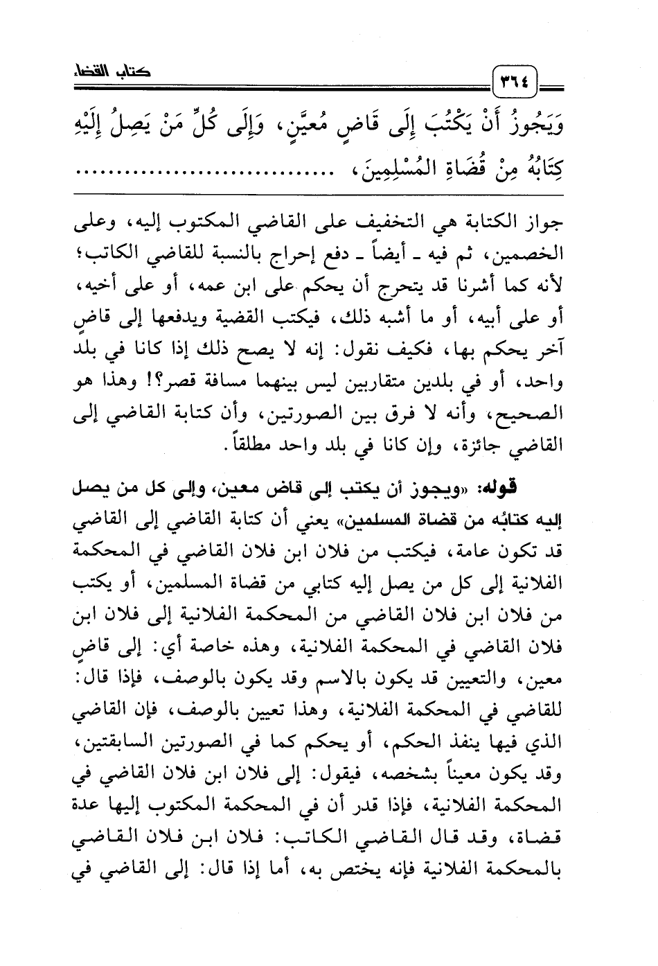 قوله: «ويجوز أن يكتب إلى قاض معين، وإلى كل من يصل إليه كتابُه من قضاة المسلمين» يعني أن كتابة القاضي إلى القاضي قد تكون عامة، فيكتب من فلان ابن فلان القاضي في المحكمة الفلانية إلى كل من يصل إليه كتابي من قضاة المسلمين، أو يكتب من فلان ابن فلان القاضي من المحكمة الفلانية إلى فلان ابن فلان القاضي في المحكمة الفلانية، وهذه خاصة أي: إلى قاضٍ معين، والتعيين قد يكون بالاسم وقد يكون بالوصف، فإذا قال: للقاضي في المحكمة الفلانية، وهذا تعيين بالوصف، فإن القاضي الذي فيها ينفذ الحكم، أو يحكم كما في الصورتين السابقتين، وقد يكون معيناً بشخصه، فيقول: إلى فلان ابن فلان القاضي في المحكمة الفلانية، فإذا قدر أن في المحكمة المكتوب إليها عدة قضاة، وقد قال القاضي الكاتب: فلان ابن فلان القاضي بالمحكمة الفلانية فإنه يختص به، أما إذا قال: إلى القاضي في