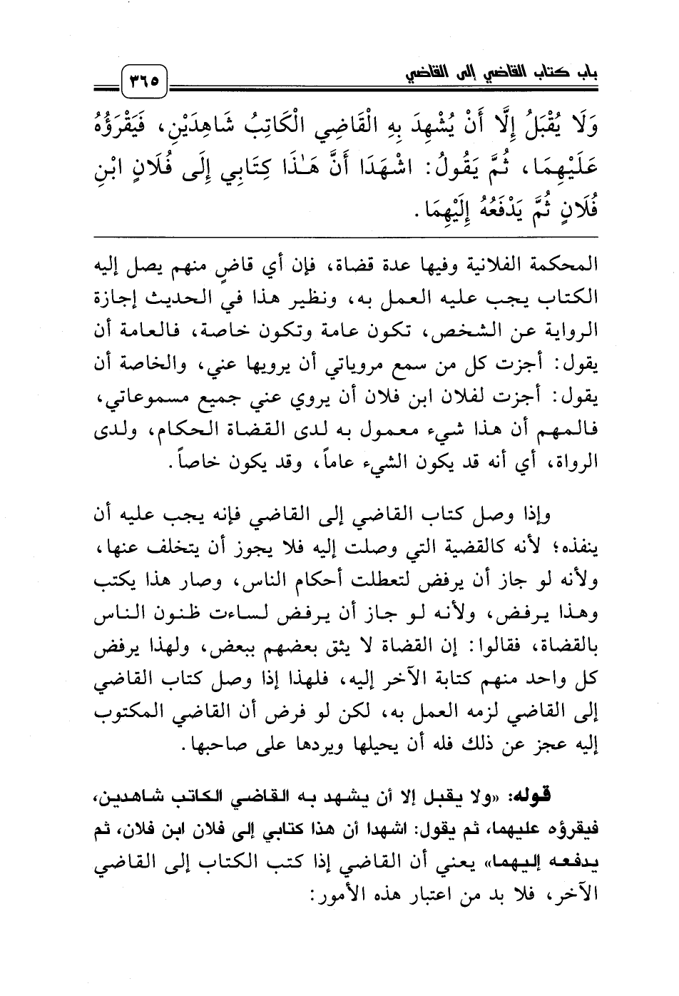 قوله: «ولا يقبل إلا أن يشهد به القاضي الكاتب شاهدين، فيقرؤه عليهما، ثم يقول: اشهدا أن هذا كتابي إلى فلان ابن فلان، ثم يدفعه إليهما» يعني أن القاضي إذا كتب الكتاب إلى القاضي الآخر، فلا بد من اعتبار هذه الأمور: