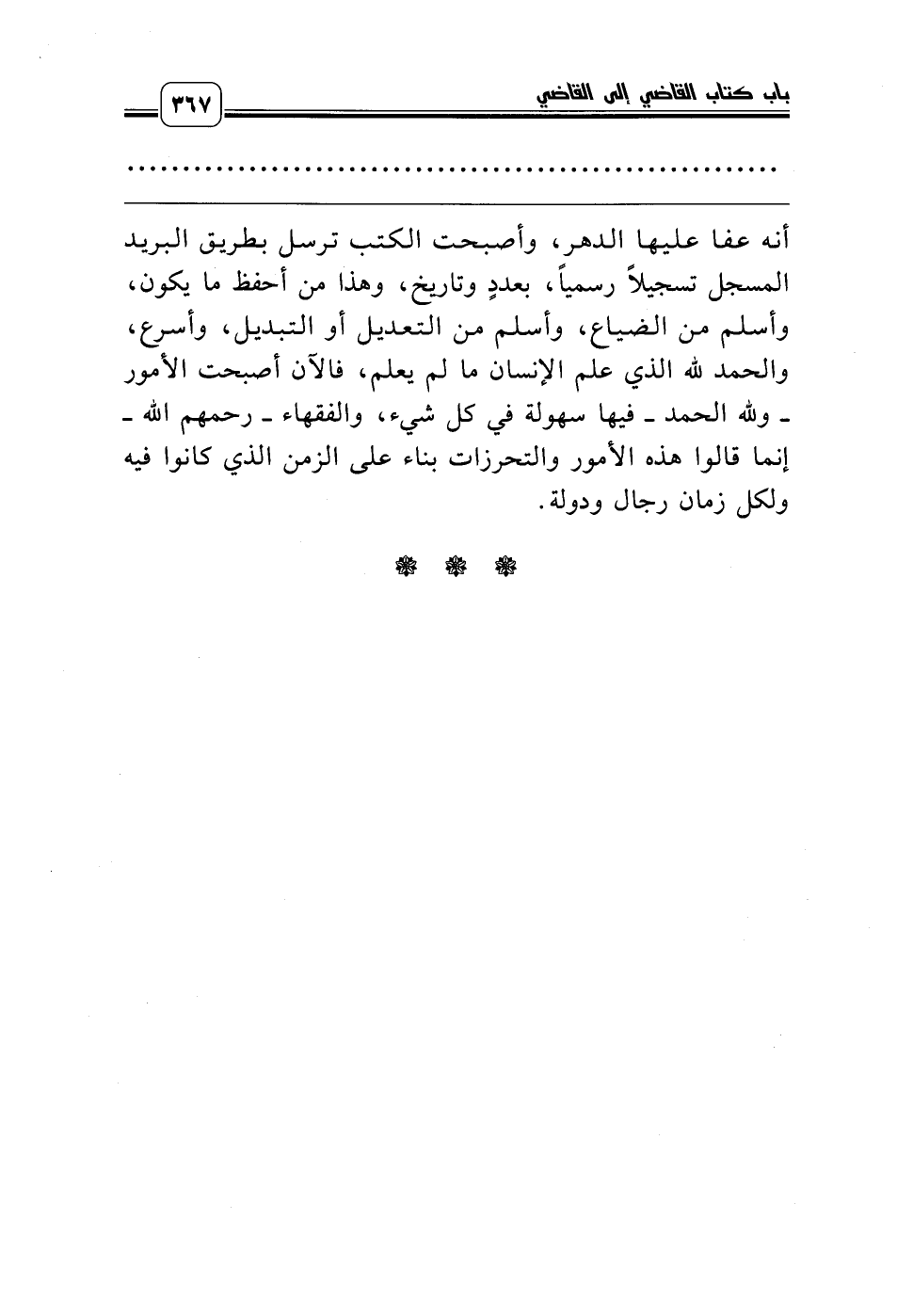 أنه عفا عليها الدهر، وأصبحت الكتب ترسل بطريق البريد المسجل تسجيلاً رسمياً، بعددٍ وتاريخ، وهذا من أحفظ ما يكون، وأسلم من الضياع، وأسلم من التعديل أو التبديل، وأسرع، والحمد لله الذي علم الإنسان ما لم يعلم، فالآن أصبحت الأمور ـ ولله الحمد ـ فيها سهولة في كل شيء، والفقهاء ـ رحمهم الله ـ إنما قالوا هذه الأمور والتحرزات بناء على الزمن الذي كانوا فيه ولكل زمان رجال ودولة.