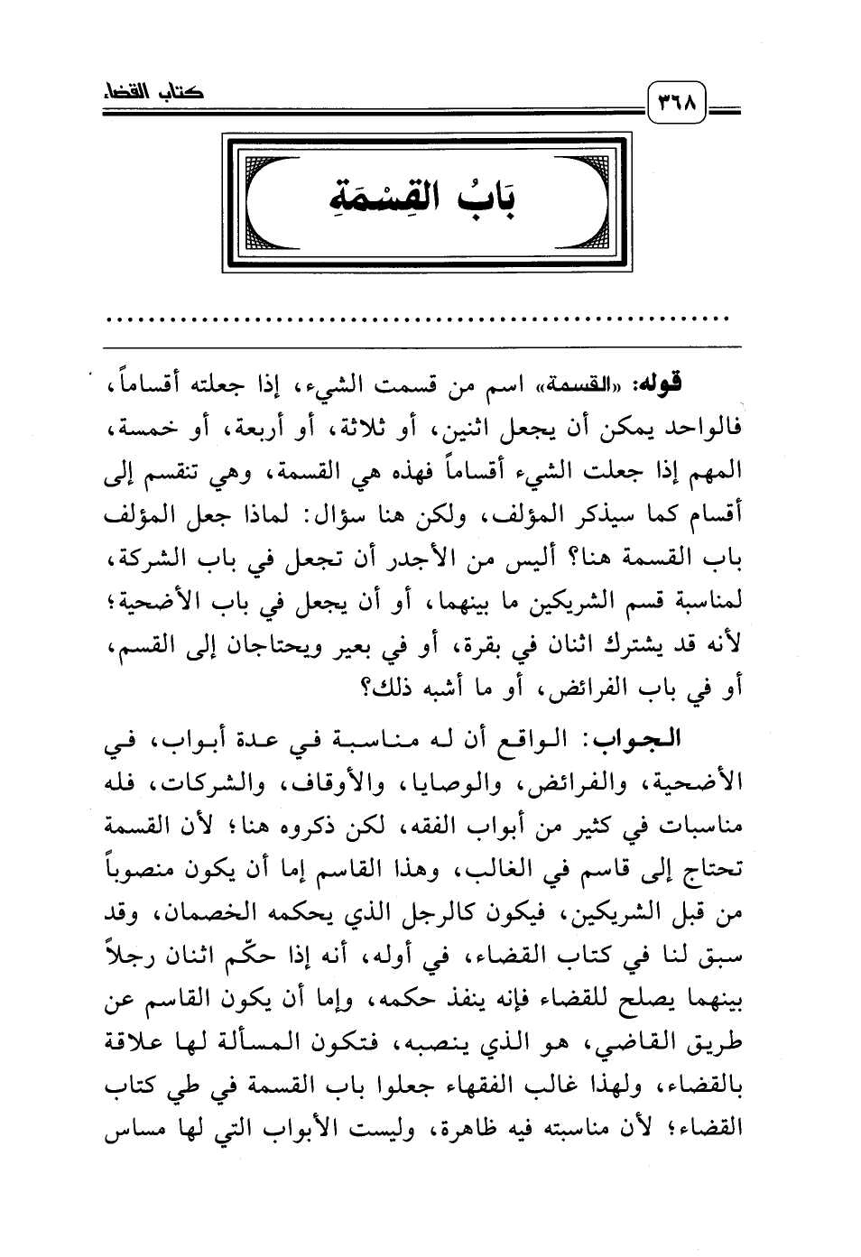 الجواب: الواقع أن له مناسبة في عدة أبواب، في الأضحية، والفرائض، والوصايا، والأوقاف، والشركات، فله مناسبات في كثير من أبواب الفقه، لكن ذكروه هنا؛ لأن القسمة تحتاج إلى قاسم في الغالب، وهذا القاسم إما أن يكون منصوباً من قبل الشريكين، فيكون كالرجل الذي يحكمه الخصمان، وقد سبق لنا في كتاب القضاء، في أوله، أنه إذا حكّم اثنان رجلاً بينهما يصلح للقضاء فإنه ينفذ حكمه، وإما أن يكون القاسم عن طريق القاضي، هو الذي ينصبه، فتكون المسألة لها علاقة بالقضاء، ولهذا غالب الفقهاء جعلوا باب القسمة في طي كتاب القضاء؛ لأن مناسبته فيه ظاهرة، وليست الأبواب التي لها مساس