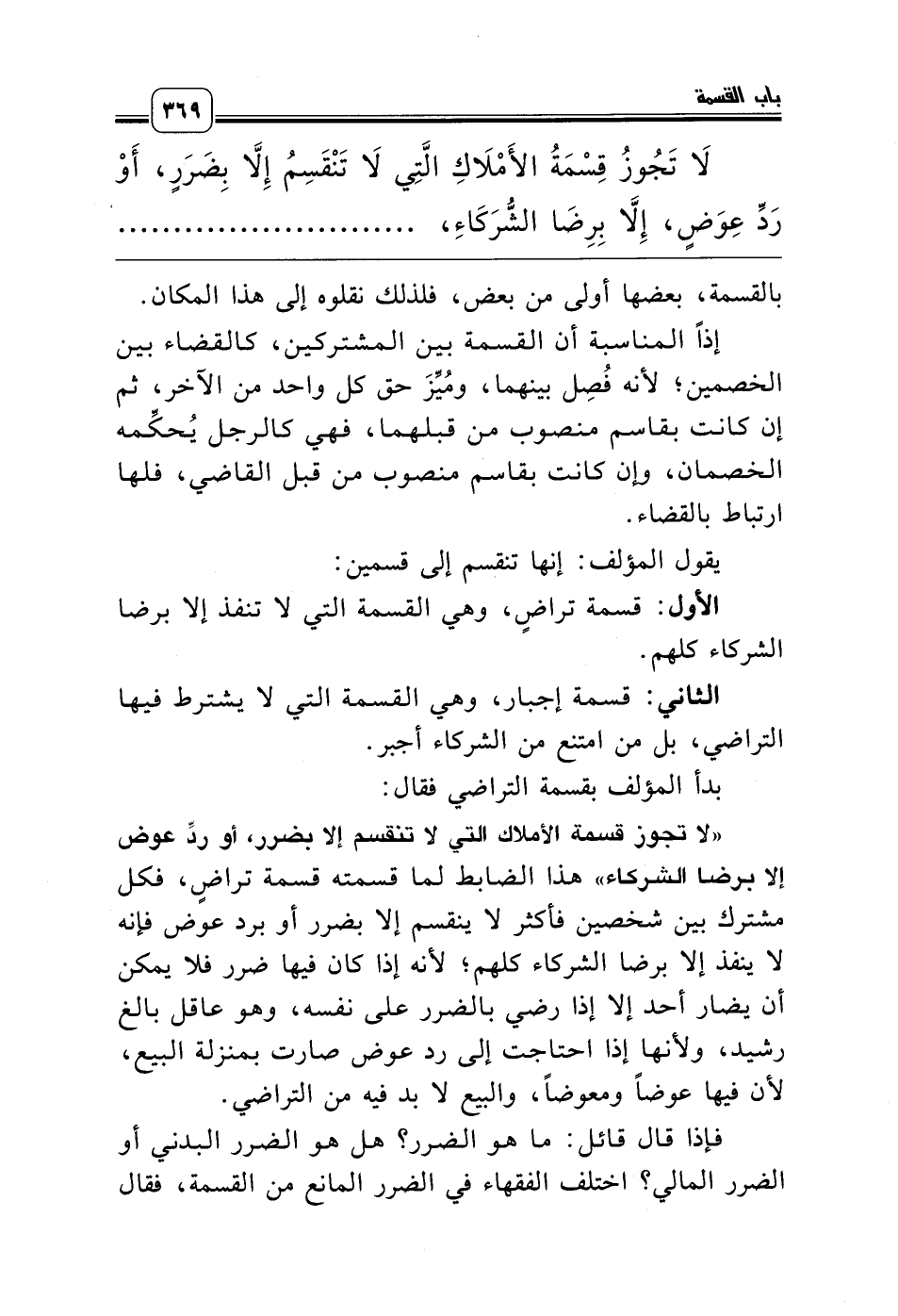 «لا تجوز قسمة الأملاك التي لا تنقسم إلا بضرر، أو ردِّ عوض إلا برضا الشركاء» هذا الضابط لما قسمته قسمة تراضٍ، فكل مشترك بين شخصين فأكثر لا ينقسم إلا بضرر أو برد عوض فإنه لا ينفذ إلا برضا الشركاء كلهم؛ لأنه إذا كان فيها ضرر فلا يمكن أن يضار أحد إلا إذا رضي بالضرر على نفسه، وهو عاقل بالغ رشيد، ولأنها إذا احتاجت إلى رد عوض صارت بمنزلة البيع، لأن فيها عوضاً ومعوضاً، والبيع لا بد فيه من التراضي.