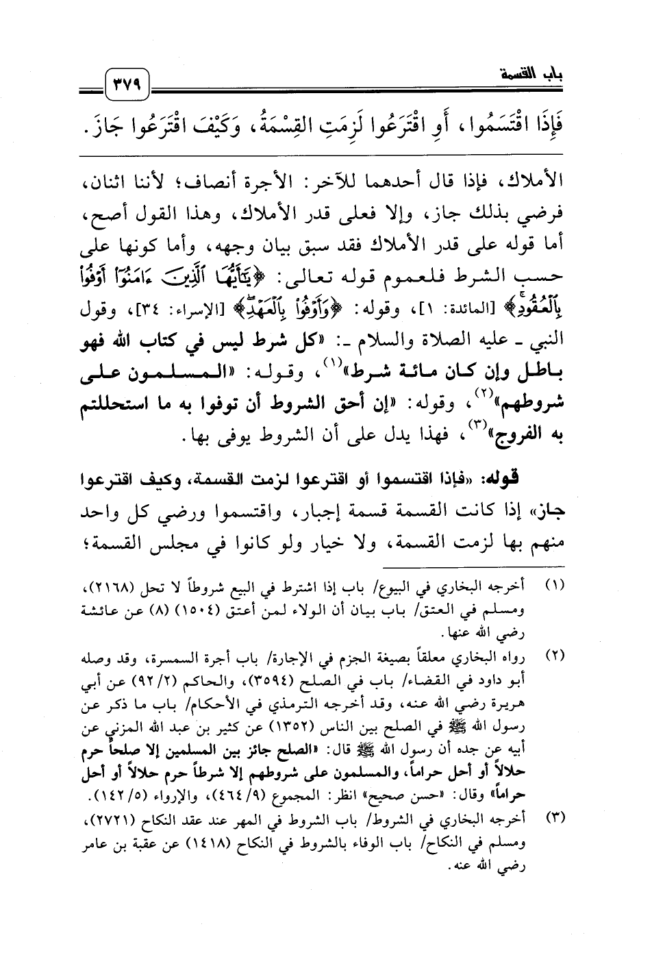 الأملاك، فإذا قال أحدهما للآخر: الأجرة أنصاف؛ لأننا اثنان، فرضي بذلك جاز، وإلا فعلى قدر الأملاك، وهذا القول أصح، أما قوله على قدر الأملاك فقد سبق بيان وجهه، وأما كونها على حسب الشرط فلعموم قوله تعالى: {يَاأَيُّهَا الَّذِينَ آمَنُوا أَوْفُوا بِالْعُقُودِ} [المائدة: 1]، وقوله: {وَأَوْفُوا بِالْعَهْدِ} [الإسراء: 34]، وقول النبي ـ عليه الصلاة والسلام ـ: «كل شرط ليس في كتاب الله فهو باطل وإن كان مائة شرط» (¬1)، وقوله: «المسلمون على شروطهم» (¬2)، وقوله: «إن أحق الشروط أن توفوا به ما استحللتم به الفروج» (¬3)، فهذا يدل على أن الشروط يوفى بها.
