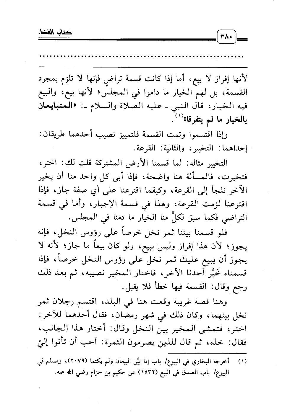 فلو قسمنا بيننا ثمر نخل خرصاً على رؤوس النخل، فإنه يجوز؛ لأن هذا إفراز وليس ببيع، ولو كان بيعاً ما جاز؛ لأنه لا يجوز أن يبيع عليك ثمر نخل على رؤوس النخل خرصاً، فإذا قسمناه خَيَّر أحدنا الآخر، فاختار المخير نصيبه، ثم بعد ذلك رجع وقال: القسمة فيها خطأ فلا يقبل.