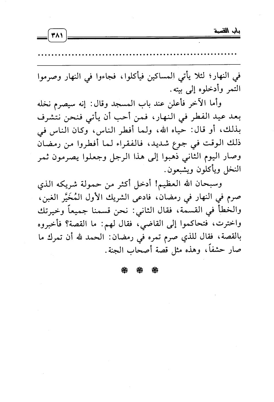 وسبحان الله العظيم! أدخل أكثر من حمولة شريكه الذي صرم في النهار في رمضان، فادعى الشريك الأول المُخَيَّر الغبن، والخطأ في القسمة، فقال الثاني: نحن قسمنا جميعاً وخيرتك واخترت، فتحاكموا إلى القاضي، فقال لهم: ما القصة؟ فأخبروه بالقصة، فقال للذي صرم تمره في رمضان: الحمد لله أن تمرك ما صار حشفاً، وهذه مثل قصة أصحاب الجنة.