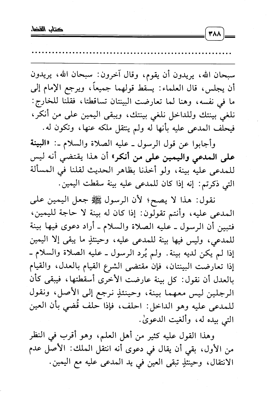 نقول: هذا لا يصح؛ لأن الرسول صلّى الله عليه وسلّم جعل اليمين على المدعى عليه، وأنتم تقولون: إذا كان له بينة لا حاجة لليمين، فتبين أن الرسول ـ عليه الصلاة والسلام ـ أراد دعوى فيها بينة للمدعي، وليس فيها بينة للمدعى عليه، وحينئذٍ ما يبقى إلا اليمين إذا لم يكن لديه بينة. ولم يُرد الرسول ـ عليه الصلاة والسلام ـ إذا تعارضت البينتان، فإن مقتضى الشرع القيام بالعدل، والقيام بالعدل أن نقول: كل بينة عارضت الأخرى أسقطتها، فيبقى كأن الرجلين ليس معهما بينة، وحينئذٍ نرجع إلى الأصل، ونقول للمدعى عليه وهو الداخل: احلف، فإذا حلف قُضي بأن العين التي بيده له، وألغيت الدعوى.
