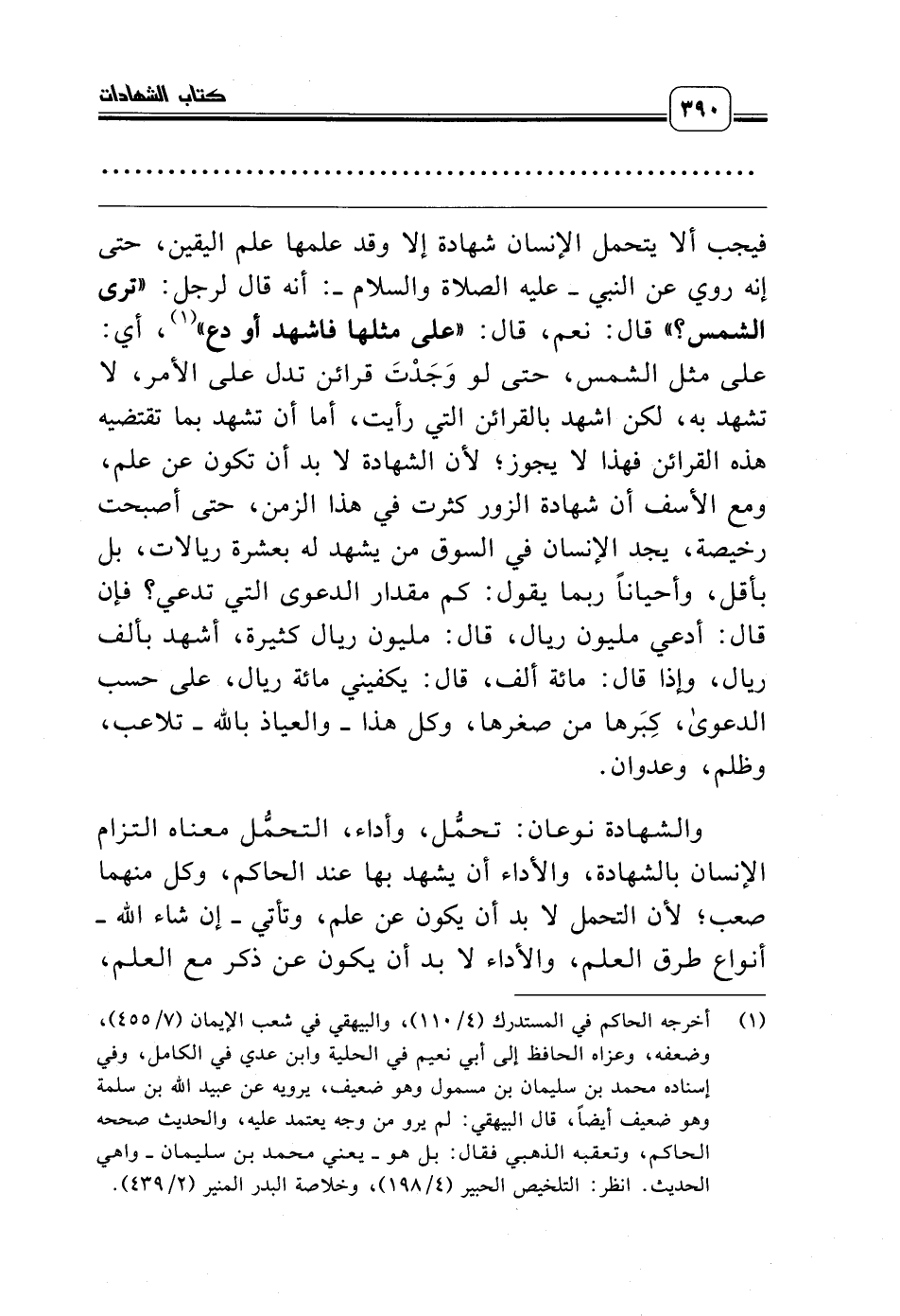 فيجب ألا يتحمل الإنسان شهادة إلا وقد علمها علم اليقين، حتى إنه روي عن النبي ـ عليه الصلاة والسلام ـ: أنه قال لرجل: «ترى الشمس؟» قال: نعم، قال: «على مثلها فاشهد أو دع» (¬1)، أي: على مثل الشمس، حتى لو وَجَدْتَ قرائن تدل على الأمر، لا تشهد به، لكن اشهد بالقرائن التي رأيت، أما أن تشهد بما تقتضيه هذه القرائن فهذا لا يجوز؛ لأن الشهادة لا بد أن تكون عن علم، ومع الأسف أن شهادة الزور كثرت في هذا الزمن، حتى أصبحت رخيصة، يجد الإنسان في السوق من يشهد له بعشرة ريالات، بل بأقل، وأحياناً ربما يقول: كم مقدار الدعوى التي تدعي؟ فإن قال: أدعي مليون ريال، قال: مليون ريال كثيرة، أشهد بألف ريال، وإذا قال: مائة ألف، قال: يكفيني مائة ريال، على حسب الدعوى، كِبَرها من صغرها، وكل هذا ـ والعياذ بالله ـ تلاعب، وظلم، وعدوان.