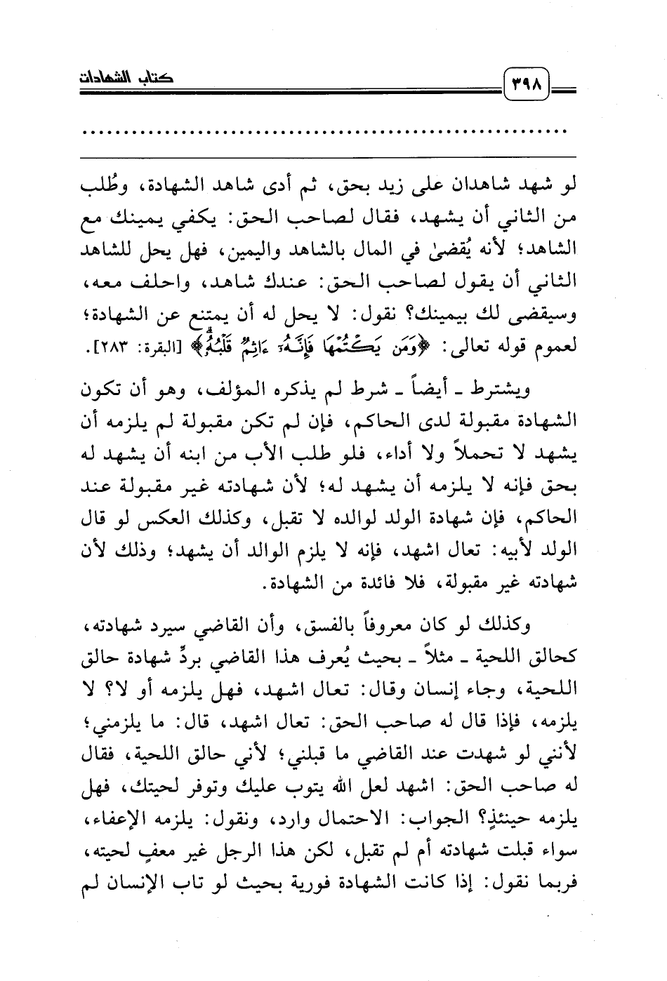 لو شهد شاهدان على زيد بحق، ثم أدى شاهد الشهادة، وطُلب من الثاني أن يشهد، فقال لصاحب الحق: يكفي يمينك مع الشاهد؛ لأنه يُقضى في المال بالشاهد واليمين، فهل يحل للشاهد الثاني أن يقول لصاحب الحق: عندك شاهد، واحلف معه، وسيقضى لك بيمينك؟ نقول: لا يحل له أن يمتنع عن الشهادة؛ لعموم قوله تعالى: {وَمَنْ يَكْتُمْهَا فَإِنَّهُ آثِمٌ قَلْبُهُ} [البقرة: 283].