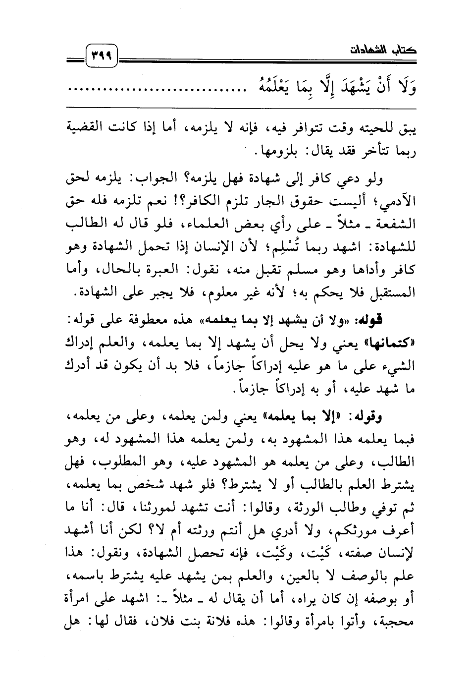 وقوله: «إلا بما يعلمه» يعني ولمن يعلمه، وعلى من يعلمه، فبما يعلمه هذا المشهود به، ولمن يعلمه هذا المشهود له، وهو الطالب، وعلى من يعلمه هو المشهود عليه، وهو المطلوب، فهل يشترط العلم بالطالب أو لا يشترط؟ فلو شهد شخص بما يعلمه، ثم توفي وطالب الورثة، وقالوا: أنت تشهد لمورثنا، قال: أنا ما أعرف مورثكم، ولا أدري هل أنتم ورثته أم لا؟ لكن أنا أشهد لإنسان صفته، كَيْت، وكَيْت، فإنه تحصل الشهادة، ونقول: هذا علم بالوصف لا بالعين، والعلم بمن يشهد عليه يشترط باسمه، أو بوصفه إن كان يراه، أما أن يقال له ـ مثلاً ـ: اشهد على امرأة محجبة، وأتوا بامرأة وقالوا: هذه فلانة بنت فلان، فقال لها: هل