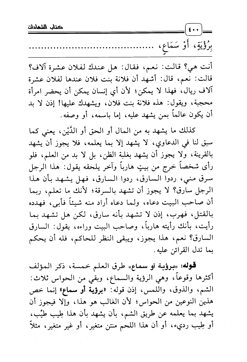 قوله: «برؤية أو سماع» طرق العلم خمسة، ذكر المؤلف أكثرها وقوعاً، وهي الرؤية والسماع، وبقي من الحواس ثلاث: الشم، والذوق، واللمس، إذن قوله: «برؤية أو سماع» إنما خص هذين النوعين من الحواس؛ لأن الغالب هو هذا، وإلا فيجوز أن يشهد بما يعلمه عن طريق الشم، بأن يشهد بأن هذا طِيب طيِّب، أو طِيب رديء، أو أن هذا اللحم منتن متغير، أو غير متغير، مثلاً
