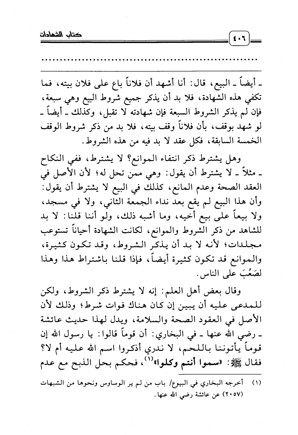 وهل يشترط ذكر انتفاء الموانع؟ لا يشترط، ففي النكاح ـ مثلاً ـ لا يشترط أن يقول: وهي ممن تحل له؛ لأن الأصل في العقد الصحة وعدم المانع، كذلك في البيع لا يشترط أن يقول: وأن هذا البيع لم يقع بعد نداء الجمعة الثاني، ولا في مسجد، ولا بيعاً على بيع أخيه، وما أشبه ذلك، ولو أننا قلنا: لا بد للشاهد من ذكر الشروط والموانع، لكانت الشهادة أحياناً تستوعب مجلدات؛ لأنه لا بد أن يذكر الشروط، وقد تكون كثيرة، والموانع قد تكون كثيرة أيضاً، فإذا قلنا باشتراط هذا وهذا لصَعُبَ على الناس.