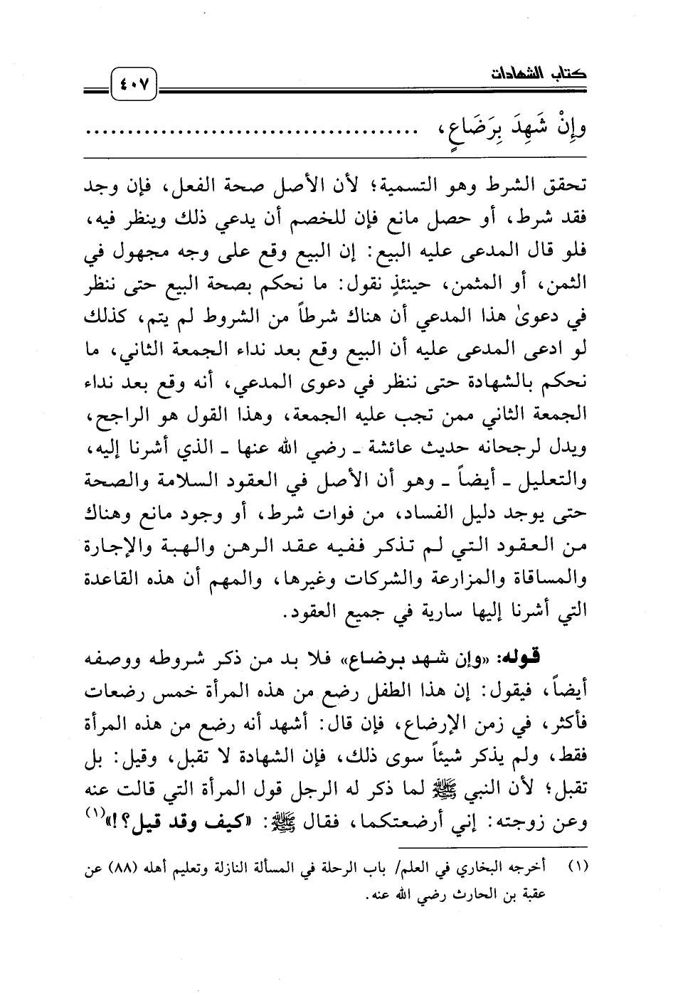 تحقق الشرط وهو التسمية؛ لأن الأصل صحة الفعل، فإن وجد فقد شرط، أو حصل مانع فإن للخصم أن يدعي ذلك وينظر فيه، فلو قال المدعى عليه البيع: إن البيع وقع على وجه مجهول في الثمن، أو المثمن، حينئذٍ نقول: ما نحكم بصحة البيع حتى ننظر في دعوى هذا المدعي أن هناك شرطاً من الشروط لم يتم، كذلك لو ادعى المدعى عليه أن البيع وقع بعد نداء الجمعة الثاني، ما نحكم بالشهادة حتى ننظر في دعوى المدعي، أنه وقع بعد نداء الجمعة الثاني ممن تجب عليه الجمعة، وهذا القول هو الراجح، ويدل لرجحانه حديث عائشة ـ رضي الله عنها ـ الذي أشرنا إليه، والتعليل ـ أيضاً ـ وهو أن الأصل في العقود السلامة والصحة حتى يوجد دليل الفساد، من فوات شرط، أو وجود مانع وهناك من العقود التي لم تذكر ففيه عقد الرهن والهبة والإجارة والمساقاة والمزارعة والشركات وغيرها، والمهم أن هذه القاعدة التي أشرنا إليها سارية في جميع العقود.