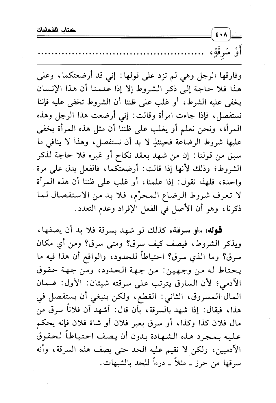 قوله: «أو سرقة» كذلك لو شهد بسرقة فلا بد أن يصفها، ويذكر الشروط، فيصف كيف سرق؟ ومتى سرق؟ ومن أي مكان سرق؟ وما الذي سرق؟ احتياطاً للحدود، والواقع أن هذا فيه ما يحتاط له من وجهين: من جهة الحدود، ومن جهة حقوق الآدمي؛ لأن السارق يترتب على سرقته شيئان: الأول: ضمان المال المسروق، الثاني: القطع، ولكن ينبغي أن يستفصل في هذا، فيقال: إذا شهد بالسرقة، بأن قال: أشهد أن فلاناً سرق من مال فلان كذا وكذا، أو سرق بعير فلان أو شاة فلان فإنه يحكم عليه بمجرد هذه الشهادة بدون أن يصف احتياطاً لحقوق الآدميين، ولكن لا نقيم عليه الحد حتى يصف هذه السرقة، وأنه سرقها من حرز ـ مثلاً ـ درءاً للحد بالشبهات.