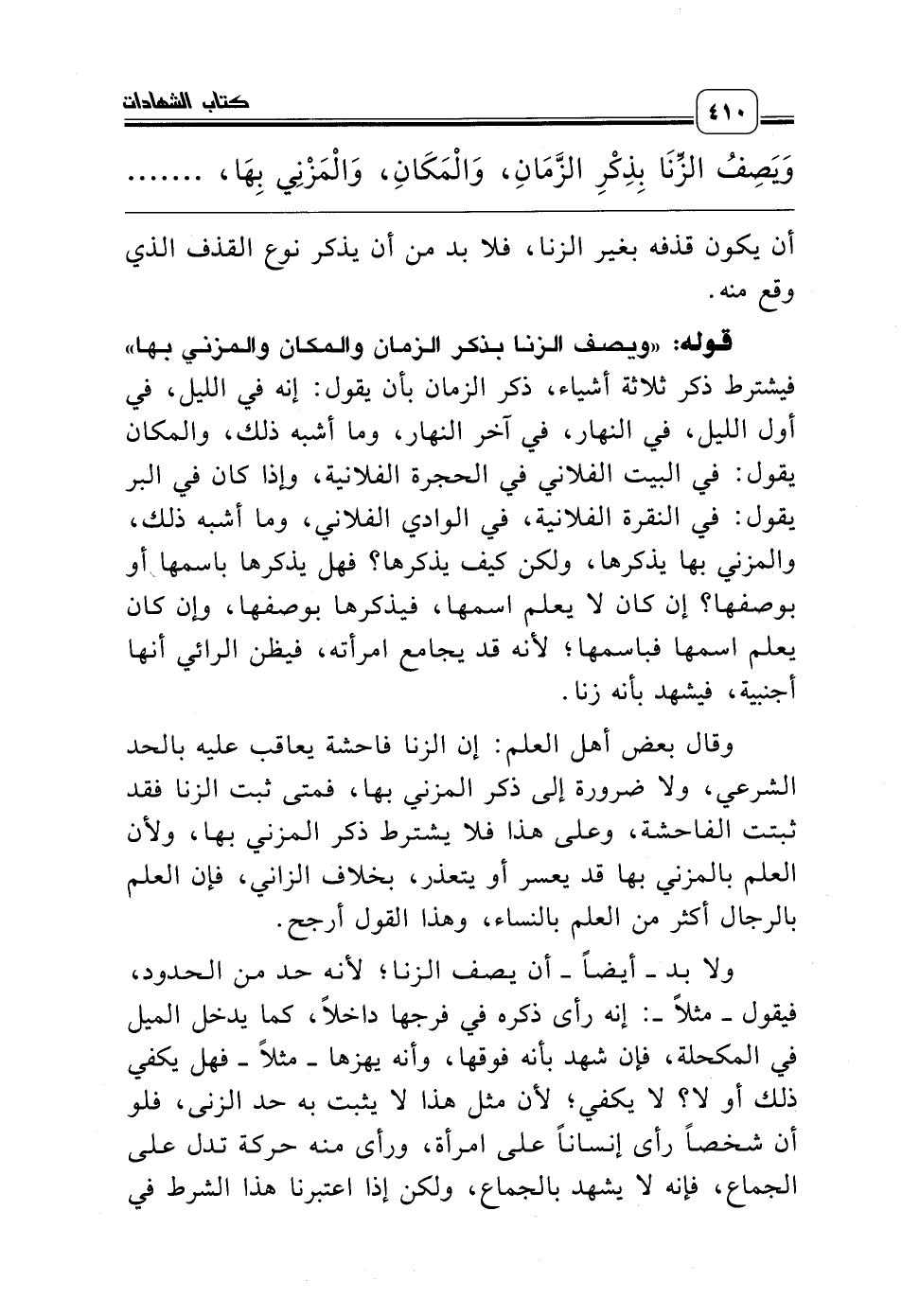 قوله: «ويصف الزنا بذكر الزمان والمكان والمزني بها» فيشترط ذكر ثلاثة أشياء، ذكر الزمان بأن يقول: إنه في الليل، في أول الليل، في النهار، في آخر النهار، وما أشبه ذلك، والمكان يقول: في البيت الفلاني في الحجرة الفلانية، وإذا كان في البر يقول: في النقرة الفلانية، في الوادي الفلاني، وما أشبه ذلك، والمزني بها يذكرها، ولكن كيف يذكرها؟ فهل يذكرها باسمها أو بوصفها؟ إن كان لا يعلم اسمها، فيذكرها بوصفها، وإن كان يعلم اسمها فباسمها؛ لأنه قد يجامع امرأته، فيظن الرائي أنها أجنبية، فيشهد بأنه زنا.