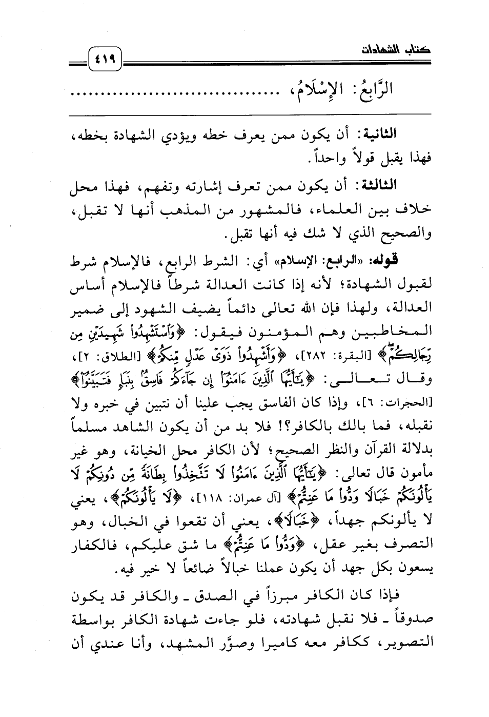 قوله: «الرابع: الإسلام» أي: الشرط الرابع، فالإسلام شرط لقبول الشهادة؛ لأنه إذا كانت العدالة شرطاً فالإسلام أساس العدالة، ولهذا فإن الله تعالى دائماً يضيف الشهود إلى ضمير المخاطبين وهم المؤمنون فيقول: {وَاسْتَشْهِدُوا شَهِيدَيْنِ مِنْ رِجَالِكُمْ} [البقرة: 282]، {وَأَشْهِدُوا ذَوَيْ عَدْلٍ مِنْكُمْ} [الطلاق: 2]، وقال تعالى: {يَاأَيُّهَا الَّذِينَ آمَنُوا إِنْ جَاءَكُمْ فَاسِقٌ بِنَبَإٍ فَتَبَيَّنُوا} [الحجرات: 6]، وإذا كان الفاسق يجب علينا أن نتبين في خبره ولا نقبله، فما بالك بالكافر؟! فلا بد من أن يكون الشاهد مسلماً بدلالة القرآن والنظر الصحيح؛ لأن الكافر محل الخيانة، وهو غير مأمون قال تعالى: {يَاأَيُّهَا الَّذِينَ آمَنُوا لاَ تَتَّخِذُوا بِطَانَةً مِنْ دُونِكُمْ لاَ يَأْلُونَكُمْ خَبَالاً وَدُّوا مَا عَنِتُّمْ} [آل عمران: 118]، {لاَ يَأْلُونَكُمْ}، يعني لا يألونكم جهداً، {خَبَالاً}، يعني أن تقعوا في الخبال، وهو التصرف بغير عقل، {وَدُّوا مَا عَنِتُّمْ} ما شق عليكم، فالكفار يسعون بكل جهد أن يكون عملنا خبالاً ضائعاً لا خير فيه.
