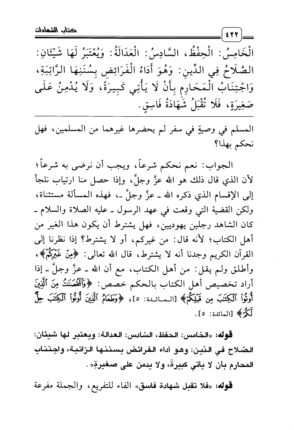 الجواب: نعم نحكم شرعاً، ويجب أن نرضى به شرعاً؛ لأن الذي قال ذلك هو الله عزّ وجل، وإذا حصل منا ارتياب نلجأ إلى الإقسام الذي ذكره الله ـ عزّ وجل ـ، فهذه المسألة مستثناة، ولكن القضية التي وقعت في عهد الرسول ـ عليه الصلاة والسلام ـ كان الشاهد رجلين يهوديين، فهل يشترط أن يكون هذا الغير من أهل الكتاب؛ لأنه قال: من غيركم، أو لا يشترط؟ إذا نظرنا إلى القرآن الكريم وجدنا أنه لا يشترط، قال الله تعالى: {مِنْ غَيْرِكُمْ}، وأطلق ولم يقل: من أهل الكتاب، مع أن الله ـ عزّ وجل ـ إذا أراد تخصيص أهل الكتاب بالحكم خصص: {وَالْمُحْصَنَاتُ مِنَ الَّذِينَ أُوتُوا الْكِتَابَ مِنْ قَبْلِكُمْ} [المائدة: 5]، {وَطَعَامُ الَّذِينَ أُوتُوا الْكِتَابَ حِلٌّ لَكُمْ} [المائدة: 5].