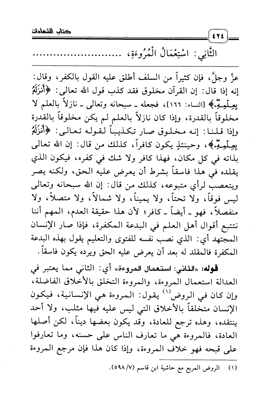 قوله: «الثاني: استعمال المروءة» أي: الثاني مما يعتبر في العدالة استعمال المروءة، والمروءة التخلق بالأخلاق الفاضلة، وإن كان في الروض (¬1) يقول: المروءة هي الإنسانية، فيكون الإنسان متخلقاً بالأخلاق التي ليس عليه فيها مثلب، ولا أحد ينتقده، وهذه ترجع للعادة، وقد يكون بعضها ديناً، لكن أصلها العادة، فالمروءة هي ما تعارف الناس على حسنه، وما تعارفوا على قبحه فهو خلاف المروءة، وإذا كان هذا فإن مرجع المروءة