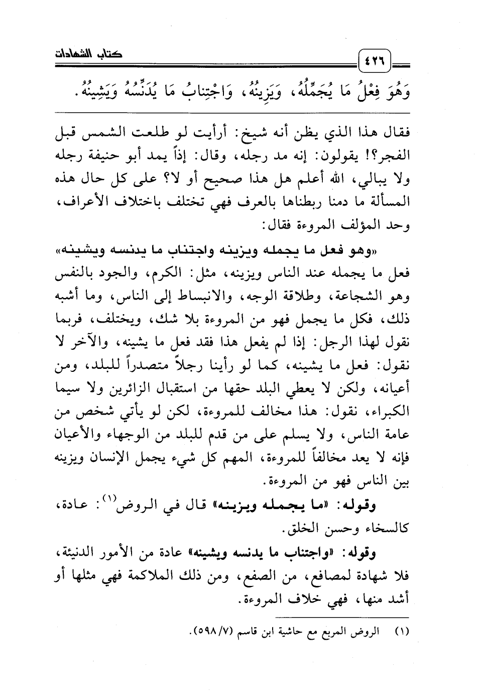 فقال هذا الذي يظن أنه شيخ: أرأيت لو طلعت الشمس قبل الفجر؟! يقولون: إنه مد رجله، وقال: إذاً يمد أبو حنيفة رجله ولا يبالي، الله أعلم هل هذا صحيح أو لا؟ على كل حال هذه المسألة ما دمنا ربطناها بالعرف فهي تختلف باختلاف الأعراف، وحد المؤلف المروءة فقال: