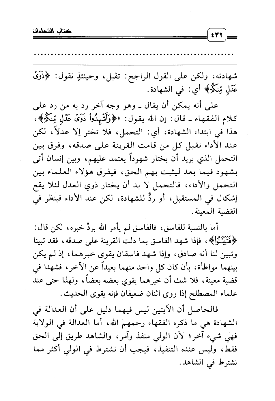 فالحاصل أن الآيتين ليس فيهما دليل على أن العدالة في الشهادة هي ما ذكره الفقهاء رحمهم الله، أما العدالة في الولاية فهي شيء آخر؛ لأن الولي منفذ وآمر، والشاهد طريق إلى الحق فقط، وليس عنده التنفيذ، فيجب أن نشترط في الولي أكثر مما نشترط في الشاهد.