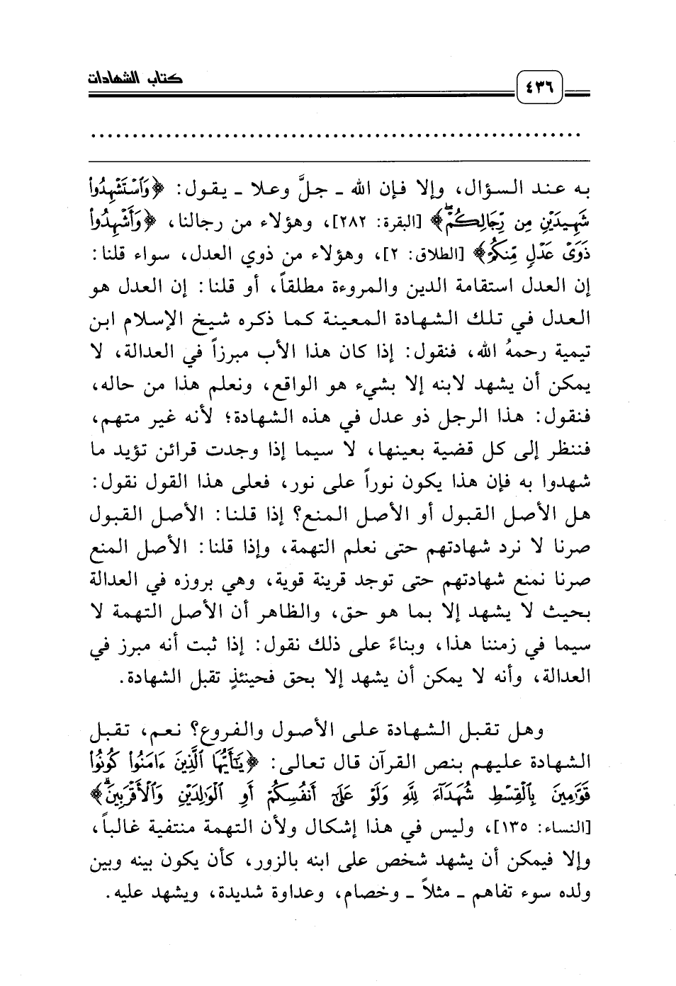 وهناك قول آخر في المسألة: أنها تقبل شهادة الأصول لفروعهم، والفروع لأصولهم إذا انتفت التهمة، وأن العبرة في كل قضية بعينها؛ وجه ذلك أن العمومات الدالة على قبول شهادة العدل لا يستثنى منها شيء، إلا بدليل واضح بيِّن يمكننا أن نقابل