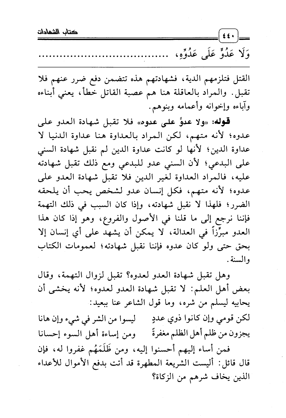 قوله: «ولا من يجر إلى نفسه نفعاً» فلا تقبل شهادته، كشريكين في مال، فباع أحدهما المال المشترك، ثم إن الأسعار نزلت فادعى المشتري أنه ما اشترى، والشريك يدعي أنه باع على هذا الذي أنكر، فشهد الشريك لشريكه فلا يقبل؛ لأنه يجر إلى نفسه نفعاً؛ لأنه إذا تم البيع استفاد هو؛ لأنه شريك فلا تقبل شهادة الشريك لشريكه فيما هو شريك فيه، كذلك لو شهد الورثة بجُرْح الموروث قبل اندماله يعني برئه، ثم مات المجروح من الجرح فإن شهادتهم لا تقبل؛ لأنهم سيجرون إلى أنفسهم نفعاً بهذه الشهادة وهو الدية، فستكون لهم، أو شهدوا أن زيداً هو الذي جرح مورثهم جرحاً مميتاً، ومات المشهود له، نقول: شهادتكم لا تقبل؛ لأنهم لما شهدوا فهم يجرون إلى أنفسهم نفعاً، إذ سيلزم الجارح دية الميت، وإذا لزمته الدية سيرثها هؤلاء الذين شهدوا، فلا تقبل شهادتهم؛ لأنهم يجرون إلى أنفسهم نفعاً.