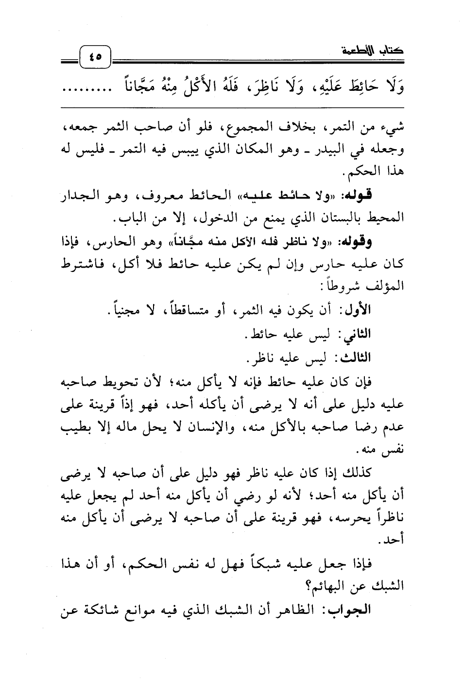 وقوله: «ولا ناظر فله الأكل منه مجَّاناً» وهو الحارس، فإذا كان عليه حارس وإن لم يكن عليه حائط فلا أكل، فاشترط المؤلف شروطاً: