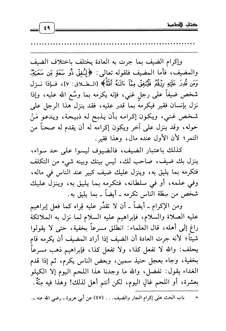 ومن الإكرام ـ أيضاً ـ أن لا تقدِّر عليه قِراه كما فعل إبراهيم عليه الصلاة والسلام، فإبراهيم عليه السلام لما نزل به الملائكة راغ إلى أهله، قال العلماء: انطلق مسرعاً بخفية، حتى لا يقولوا شيئاً؛ لأنه جرت العادة أن الضيف إذا أراد المضيف أن يكرمه قام يحلف: والله لا تفعل كذا، ولا تفعل كذا، فإبراهيم ذهب مسرعاً بخفية، وجاء بعجل حنيذ سمين، وبعض الناس يكرم، ثم إذا قدم الغداء يقول: تفضل، والله ما وجدنا هذا اللحم اليوم إلا الكيلو بعشرة، أو اللحم غالٍ اليوم، لكن أنتم أهل لذلك! وهذا فيه مِنّةٌ.
