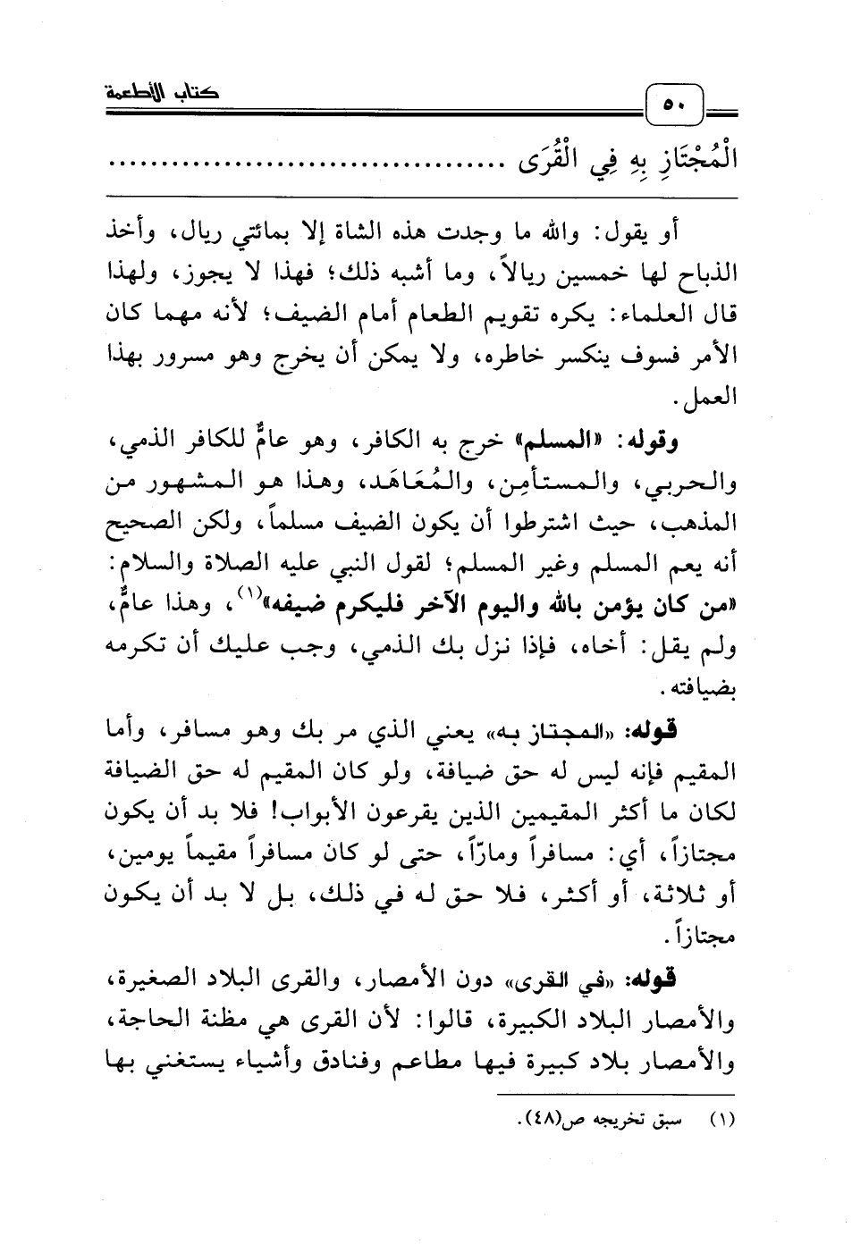 وقوله: «المسلم» خرج به الكافر، وهو عامٌّ للكافر الذمي، والحربي، والمستأمِن، والمُعَاهَد، وهذا هو المشهور من المذهب، حيث اشترطوا أن يكون الضيف مسلماً، ولكن الصحيح أنه يعم المسلم وغير المسلم؛ لقول النبي عليه الصلاة والسلام: «من كان يؤمن بالله واليوم الآخر فليكرم ضيفه» (¬1)، وهذا عامٌّ، ولم يقل: أخاه، فإذا نزل بك الذمي، وجب عليك أن تكرمه بضيافته.