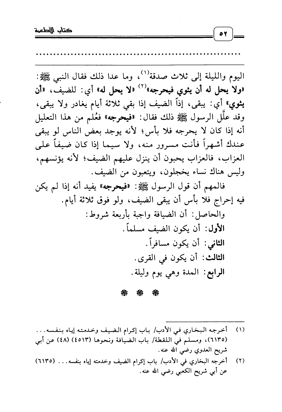 اليوم والليلة إلى ثلاث صدقة (¬1)، وما عدا ذلك فقال النبي صلّى الله عليه وسلّم: «ولا يحل له أن يثوي فيحرجه» (¬2) «لا يحل له» أي: للضيف، «أن يثوي» أي: يبقى، إذاً الضيف إذا بقي ثلاثة أيام يغادر ولا يبقى، وقد علَّل الرسول صلّى الله عليه وسلّم ذلك فقال: «فيحرجه» فعُلم من هذا التعليل أنه إذا كان لا يحرجه فلا بأس؛ لأنه يوجد بعض الناس لو يبقى عندك أشهراً فأنت مسرور منه، ولا سيما إذا كان ضيفاً على العزاب، فالعزاب يحبون أن ينزل عليهم الضيف؛ لأنه يؤنسهم، وليس هناك نساء يخجلون، ويتعبون من الضيف.