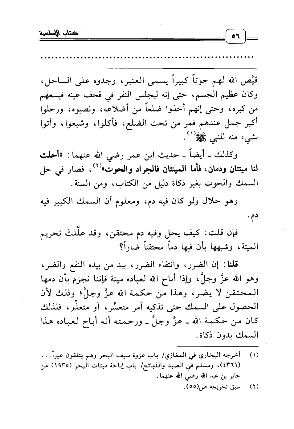 وكذلك ـ أيضاً ـ حديث ابن عمر رضي الله عنهما: «أحلت لنا ميتتان ودمان، فأما الميتتان فالجراد والحوت» (¬2)، فصار في حل السمك والحوت بغير ذكاة دليل من الكتاب، ومن السنة.