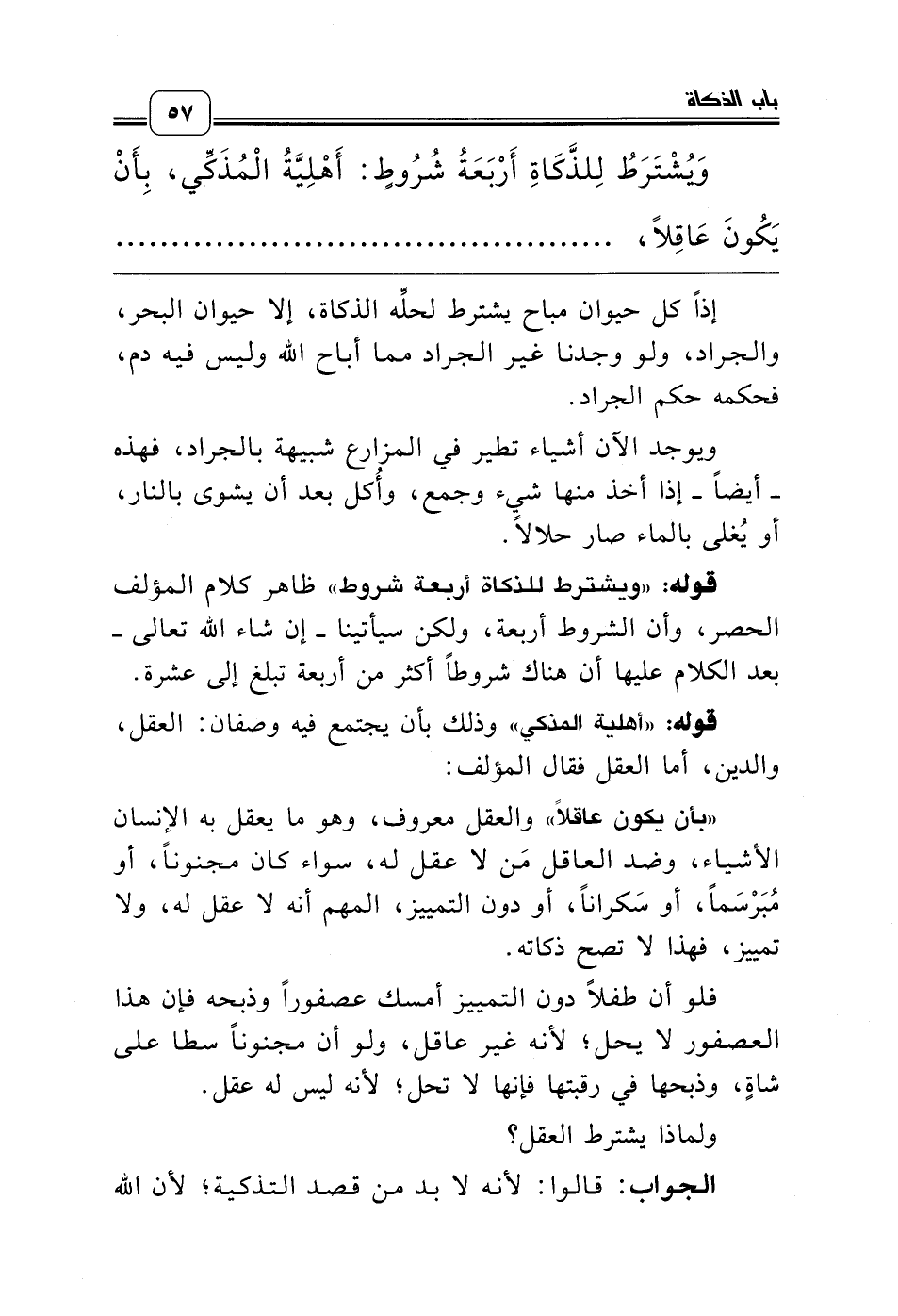 «بأن يكون عاقلاً» والعقل معروف، وهو ما يعقل به الإنسان الأشياء، وضد العاقل مَن لا عقل له، سواء كان مجنوناً، أو مُبَرْسَماً، أو سَكراناً، أو دون التمييز، المهم أنه لا عقل له، ولا تمييز، فهذا لا تصح ذكاته.
