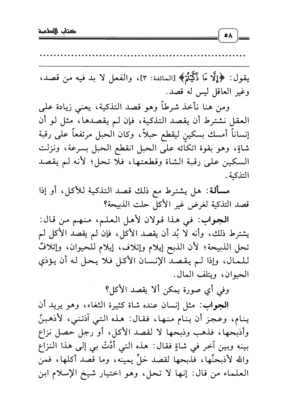 ومن هنا نأخذ شرطاً وهو قصد التذكية، يعني زيادة على العقل نشترط أن يقصد التذكية، فإن لم يقصدها، مثل لو أن إنساناً أمسك بسكينٍ ليقطع حبلاً، وكان الحبل مرتفعاً على رقبة شاةٍ، وهو بقوة اتكائه على الحبل انقطع الحبل بسرعة، ونزلت السكين على رقبة الشاة وقطعتها، فلا تحل؛ لأنه لم يقصد التذكية.