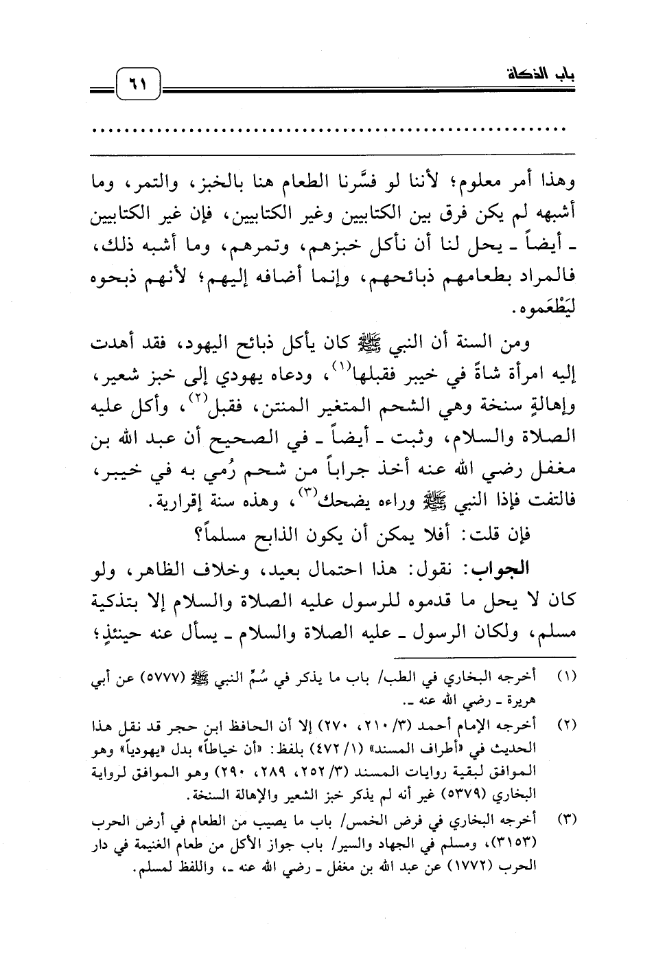 ومن السنة أن النبي صلّى الله عليه وسلّم كان يأكل ذبائح اليهود، فقد أهدت إليه امرأة شاةً في خيبر فقبلها (¬1)، ودعاه يهودي إلى خبز شعير، وإهالةٍ سنخة وهي الشحم المتغير المنتن، فقبل (¬2)، وأكل عليه الصلاة والسلام، وثبت ـ أيضاً ـ في الصحيح أن عبد الله بن مغفل رضي الله عنه أخذ جراباً من شحم رُمي به في خيبر، فالتفت فإذا النبي صلّى الله عليه وسلّم وراءه يضحك (¬3)، وهذه سنة إقرارية.