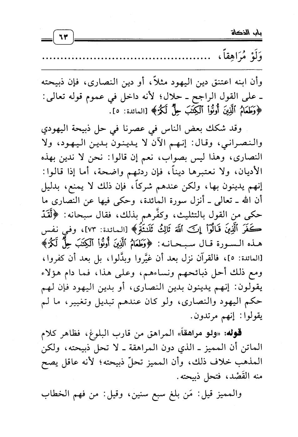 قوله: «ولو مراهقاً» المراهق من قارب البلوغ، فظاهر كلام الماتن أن المميز ـ الذي دون المراهقة ـ لا تحل ذبيحته، ولكن المذهب خلاف ذلك، وأن المميز تحلّ ذبيحته؛ لأنه عاقل يصح منه القَصْد، فتحل ذبيحته.