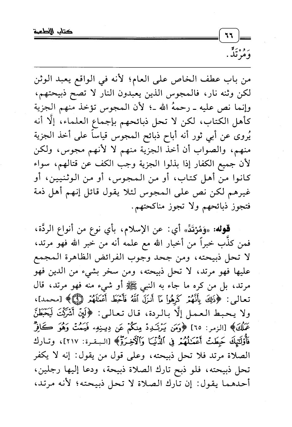 قوله: «وَمُرْتَدٍّ» أي: عن الإسلام، بأي نوع من أنواع الردَّة، فمن كذَّب خبراً من أخبار الله مع علمه أنه من خبر الله فهو مرتد، لا تحل ذبيحته، ومن جحد وجوب الفرائض الظاهرة المجمع عليها فهو مرتد، لا تحل ذبيحته، ومن سخر بشيء من الدين فهو مرتد، بل من كره ما جاء به النبي صلّى الله عليه وسلّم أو شيء منه فهو مرتد، قال تعالى: {ذَلِكَ بِأَنَّهُمْ كَرِهُوا مَا أَنْزَلَ اللَّهُ فَأَحْبَطَ أَعْمَالَهُمْ *} [محمد]، ولا يحبط العمل إلاَّ بالردة، قال تعالى: {لَئِنْ أَشْرَكْتَ لَيَحْبَطَنَّ عَمَلُكَ} [الزمر: 65] {وَمَنْ يَرْتَدِدْ مِنْكُمْ عَنْ دِينِهِ فَيَمُتْ وَهُوَ كَافِرٌ فَأُولَئِكَ حَبِطَتْ أَعْمَالُهُمْ فِي الدُّنْيَا وَالآخِرَةِ} [البقرة: 217]، وتارك الصلاة مرتد فلا تحل ذبيحته، وعلى قول من يقول: إنه لا يكفر تحل ذبيحته، فلو ذبح تارك الصلاة ذبيحة، ودعا إليها رجلين، أحدهما يقول: إن تارك الصلاة لا تحل ذبيحته؛ لأنه مرتد،