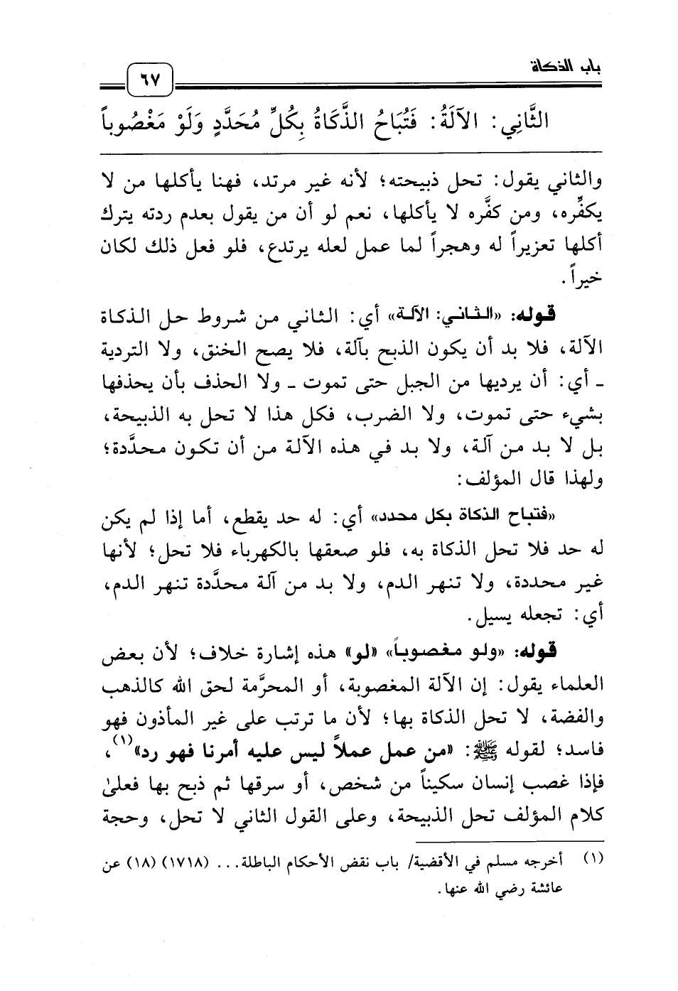 قوله: «ولو مغصوباً» «لو» هذه إشارة خلاف؛ لأن بعض العلماء يقول: إن الآلة المغصوبة، أو المحرَّمة لحق الله كالذهب والفضة، لا تحل الذكاة بها؛ لأن ما ترتب على غير المأذون فهو فاسد؛ لقوله صلّى الله عليه وسلّم: «من عمل عملاً ليس عليه أمرنا فهو رد» (¬1)، فإذا غصب إنسان سكيناً من شخص، أو سرقها ثم ذبح بها فعلى كلام المؤلف تحل الذبيحة، وعلى القول الثاني لا تحل، وحجة