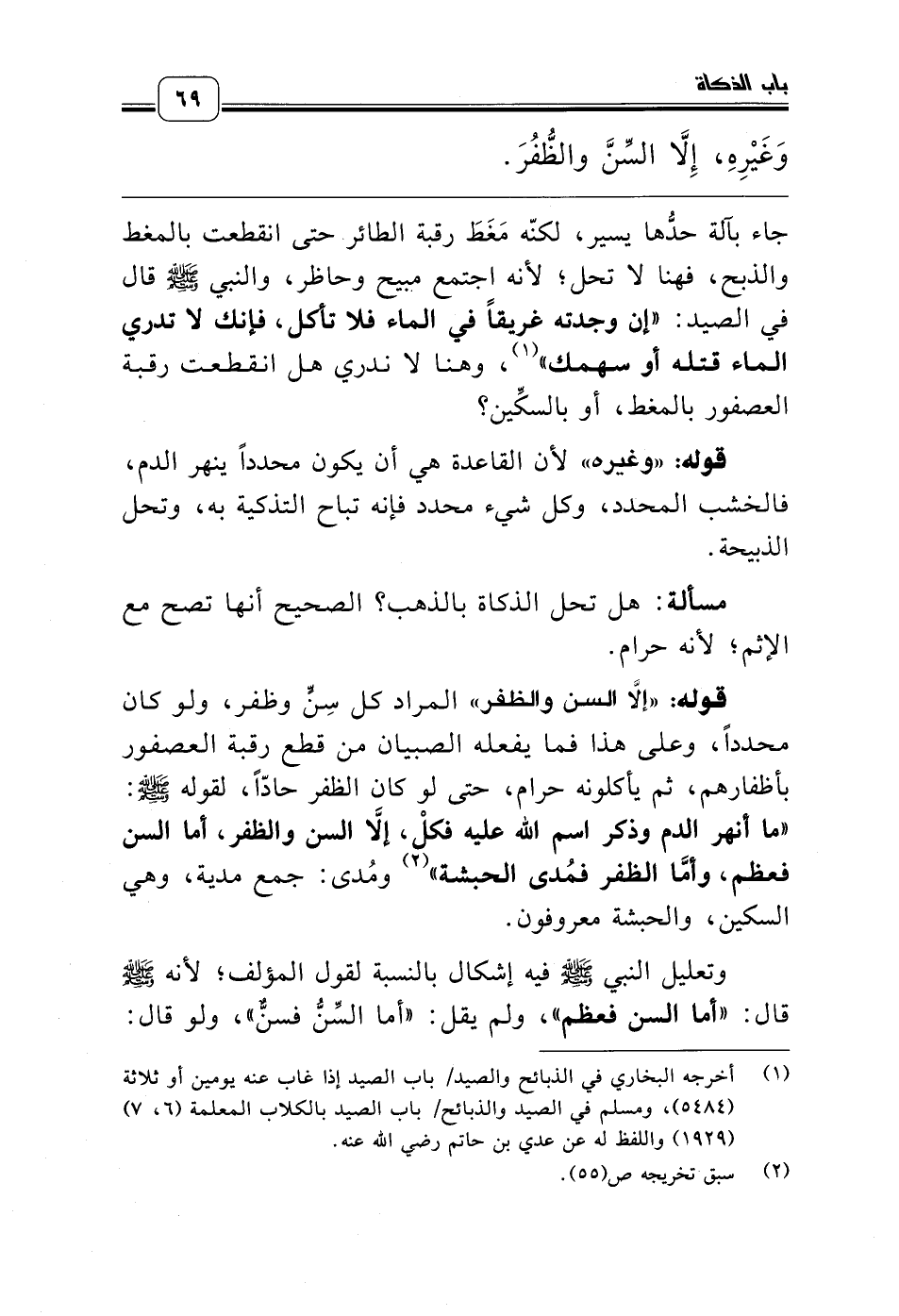قوله: «إلاَّ السن والظفر» المراد كل سِنٍّ وظفر، ولو كان محدداً، وعلى هذا فما يفعله الصبيان من قطع رقبة العصفور بأظفارهم، ثم يأكلونه حرام، حتى لو كان الظفر حادّاً، لقوله صلّى الله عليه وسلّم: «ما أنهر الدم وذكر اسم الله عليه فكلْ، إلاَّ السن والظفر، أما السن فعظم، وأمَّا الظفر فمُدى الحبشة» (¬2) ومُدى: جمع مدية، وهي السكين، والحبشة معروفون.