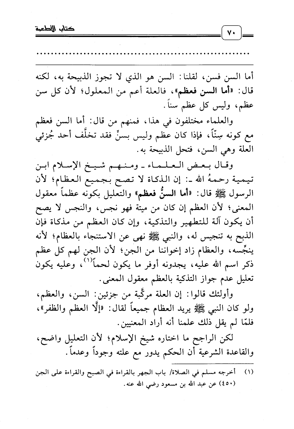 وقال بعض العلماء ـ ومنهم شيخ الإسلام ابن تيمية رحمه الله ـ: إن الذكاة لا تصح بجميع العظام؛ لأن الرسول صلّى الله عليه وسلّم قال: «أما السنُّ فعظم» والتعليل بكونه عظماً معقول المعنى؛ لأن العظم إن كان من ميتة فهو نجس، والنجس لا يصح أن يكون آلة للتطهير والتذكية، وإن كان العظم من مذكاة فإن الذبح به تنجيس له، والنبي صلّى الله عليه وسلّم نهى عن الاستنجاء بالعظام؛ لأنه ينجِّسه، والعظام زاد إخواننا من الجن؛ لأن الجن لهم كل عظم ذكر اسم الله عليه، يجدونه أوفر ما يكون لحماً (¬1)، وعليه يكون تعليل عدم جواز التذكية بالعظم معقول المعنى.