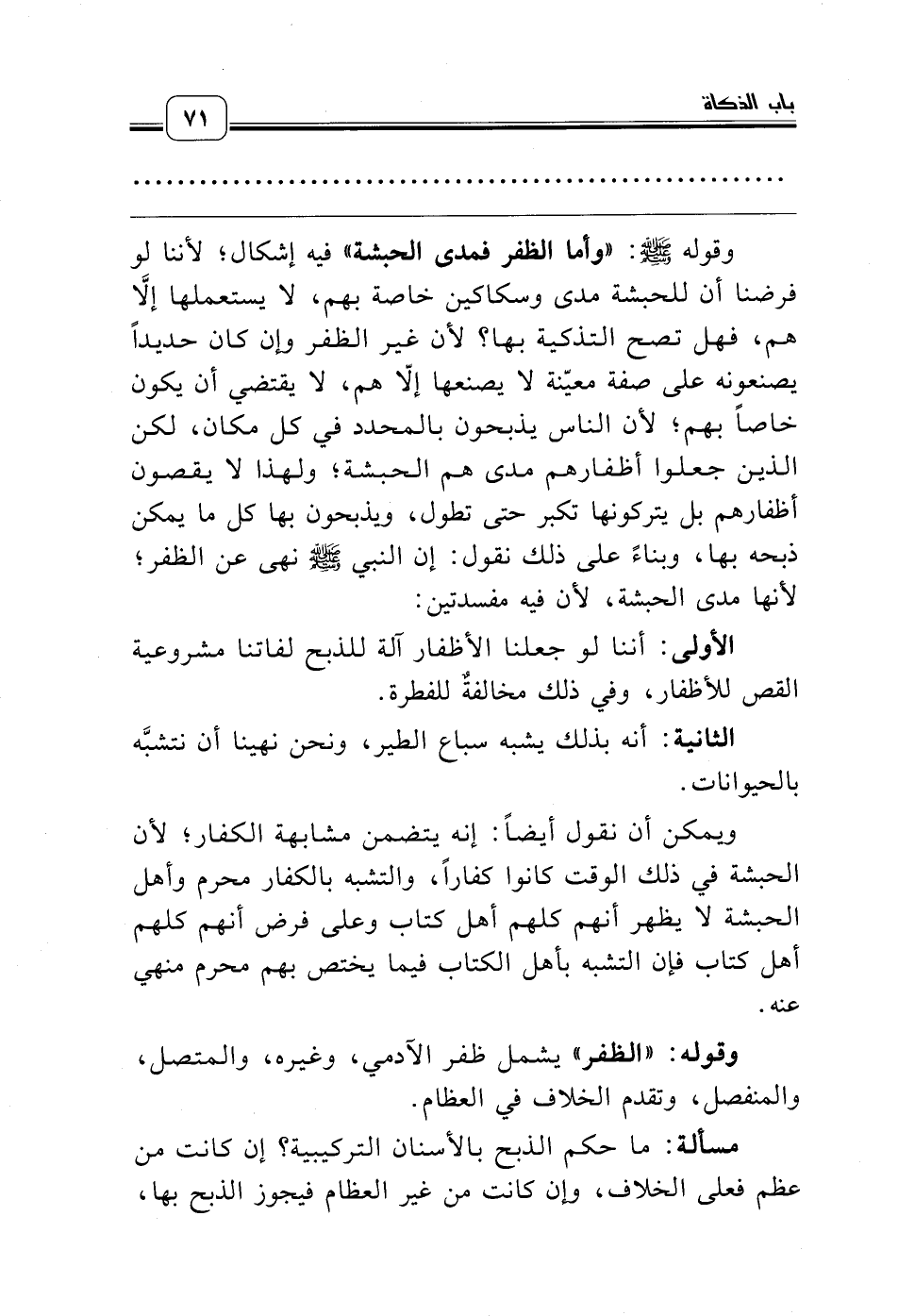 وقوله صلّى الله عليه وسلّم: «وأما الظفر فمدى الحبشة» فيه إشكال؛ لأننا لو فرضنا أن للحبشة مدى وسكاكين خاصة بهم، لا يستعملها إلاَّ هم، فهل تصح التذكية بها؟ لأن غير الظفر وإن كان حديداً يصنعونه على صفة معيّنة لا يصنعها إلاّ هم، لا يقتضي أن يكون خاصاً بهم؛ لأن الناس يذبحون بالمحدد في كل مكان، لكن الذين جعلوا أظفارهم مدى هم الحبشة؛ ولهذا لا يقصون أظفارهم بل يتركونها تكبر حتى تطول، ويذبحون بها كل ما يمكن ذبحه بها، وبناءً على ذلك نقول: إن النبي صلّى الله عليه وسلّم نهى عن الظفر؛ لأنها مدى الحبشة، لأن فيه مفسدتين: