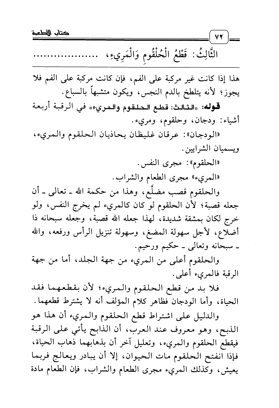 قوله: «الثالث: قطع الحلقوم والمريء» في الرقبة أربعة أشياء: ودجان، وحلقوم، ومريء.