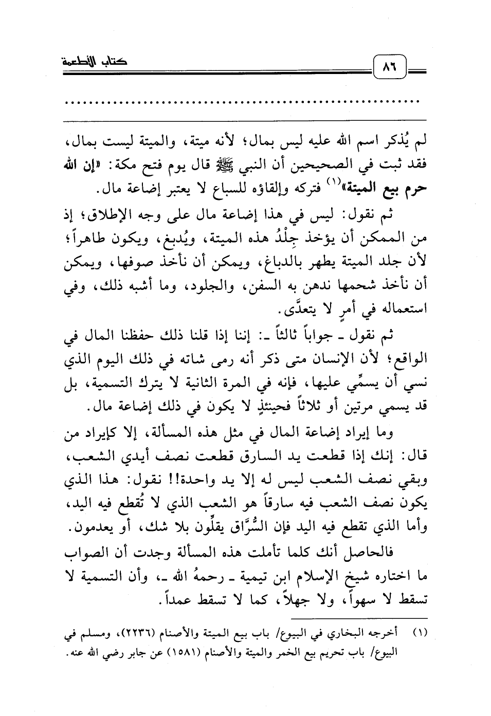 لم يُذكر اسم الله عليه ليس بمال؛ لأنه ميتة، والميتة ليست بمال، فقد ثبت في الصحيحين أن النبي صلّى الله عليه وسلّم قال يوم فتح مكة: «إن الله حرم بيع الميتة» (¬1) فتركه وإلقاؤه للسباع لا يعتبر إضاعة مال.