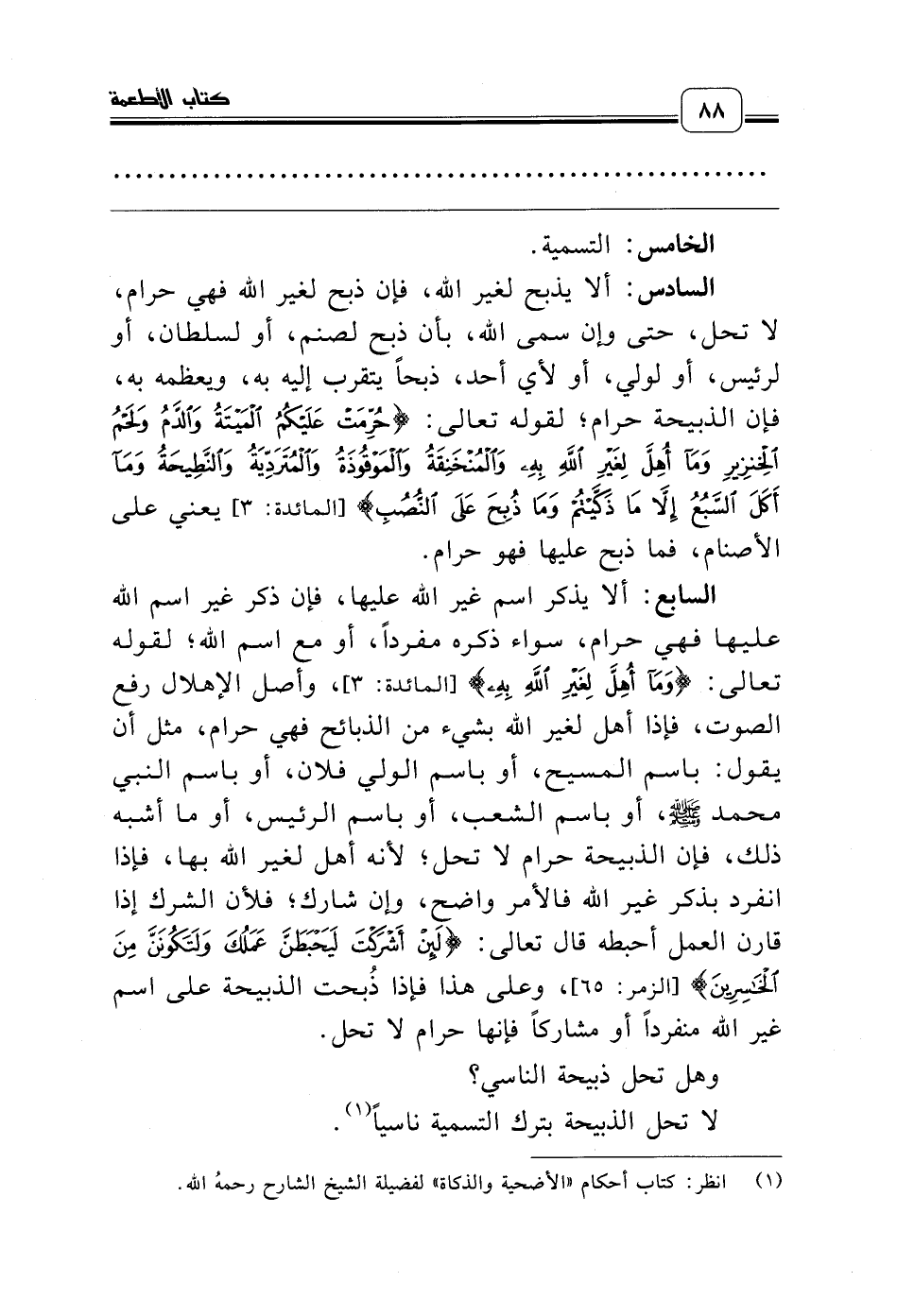 السابع: ألا يذكر اسم غير الله عليها، فإن ذكر غير اسم الله عليها فهي حرام، سواء ذكره مفرداً، أو مع اسم الله؛ لقوله تعالى: {وَمَا أُهِلَّ لِغَيْرِ اللَّهِ بِهِ} [المائدة: 3]، وأصل الإهلال رفع الصوت، فإذا أهل لغير الله بشيء من الذبائح فهي حرام، مثل أن يقول: باسم المسيح، أو باسم الولي فلان، أو باسم النبي محمد صلّى الله عليه وسلّم، أو باسم الشعب، أو باسم الرئيس، أو ما أشبه ذلك، فإن الذبيحة حرام لا تحل؛ لأنه أهل لغير الله بها، فإذا انفرد بذكر غير الله فالأمر واضح، وإن شارك؛ فلأن الشرك إذا قارن العمل أحبطه قال تعالى: {لَئِنْ أَشْرَكْتَ لَيَحْبَطَنَّ عَمَلُكَ وَلَتَكُونَنَّ مِنَ الْخَاسِرِينَ} [الزمر: 65]، وعلى هذا فإذا ذُبحت الذبيحة على اسم غير الله منفرداً أو مشاركاً فإنها حرام لا تحل.