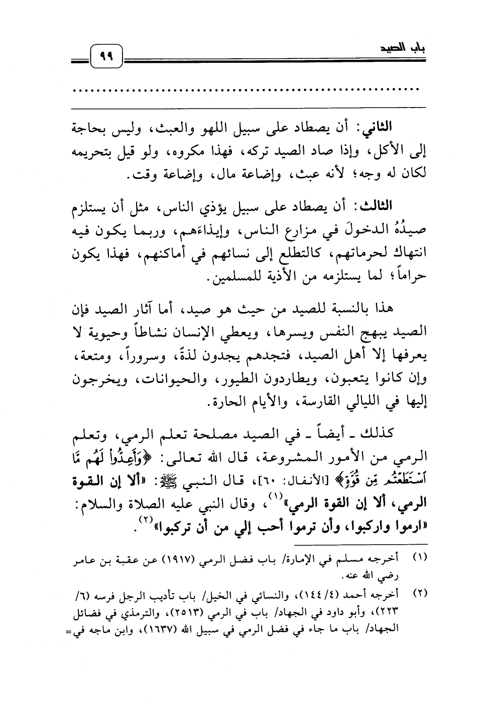 كذلك ـ أيضاً ـ في الصيد مصلحة تعلم الرمي، وتعلم الرمي من الأمور المشروعة، قال الله تعالى: {وَأَعِدُّوا لَهُمْ مَا اسْتَطَعْتُمْ مِنْ قُوَّةٍ} [الأنفال: 60]، قال النبي صلّى الله عليه وسلّم: «ألا إن القوة الرمي، ألا إن القوة الرمي» (¬1)، وقال النبي عليه الصلاة والسلام: «ارموا واركبوا، وأن ترموا أحب إلي من أن تركبوا» (¬2).