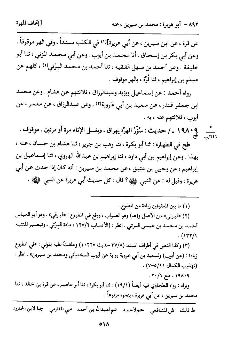طح في الطهارة: ثنا أبو بكرة، ثنا وهب بن جرير، ثنا هشام بن حسان، عنه، بهذا. وعن إبراهيم بن أبي داود، ثنا إبراهيم بن عبد الله الهروي، ثنا إسماعيل بن إبراهيم، عن يحيى بن عتيق، عن محمد بن سيرين: أنه كان إذا حدث عن أبي هريرة، وقيل له: عن النبي - صَلَّى اللَّهُ عَلَيْهِ وَسَلَّمَ -؟ قال: كل حديث أبي هريرة عن النبي - صَلَّى اللَّهُ عَلَيْهِ وَسَلَّمَ -.