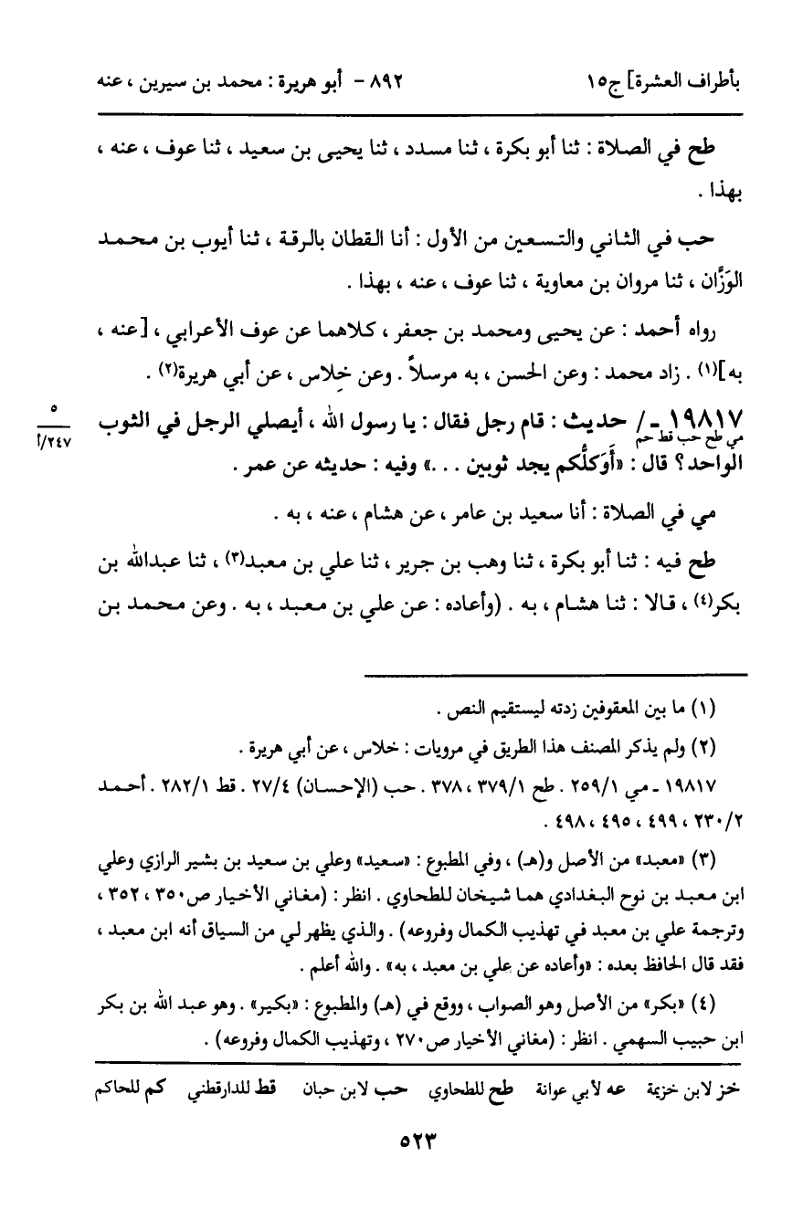 -[524]- خزيمة، عن محمد بن عبد الله الأنصاري، عن هشام، به) وعن محمد بن عمرو، ثنا أبو معاوية، عن عاصم، عن ابن سيرين، ببعضه.